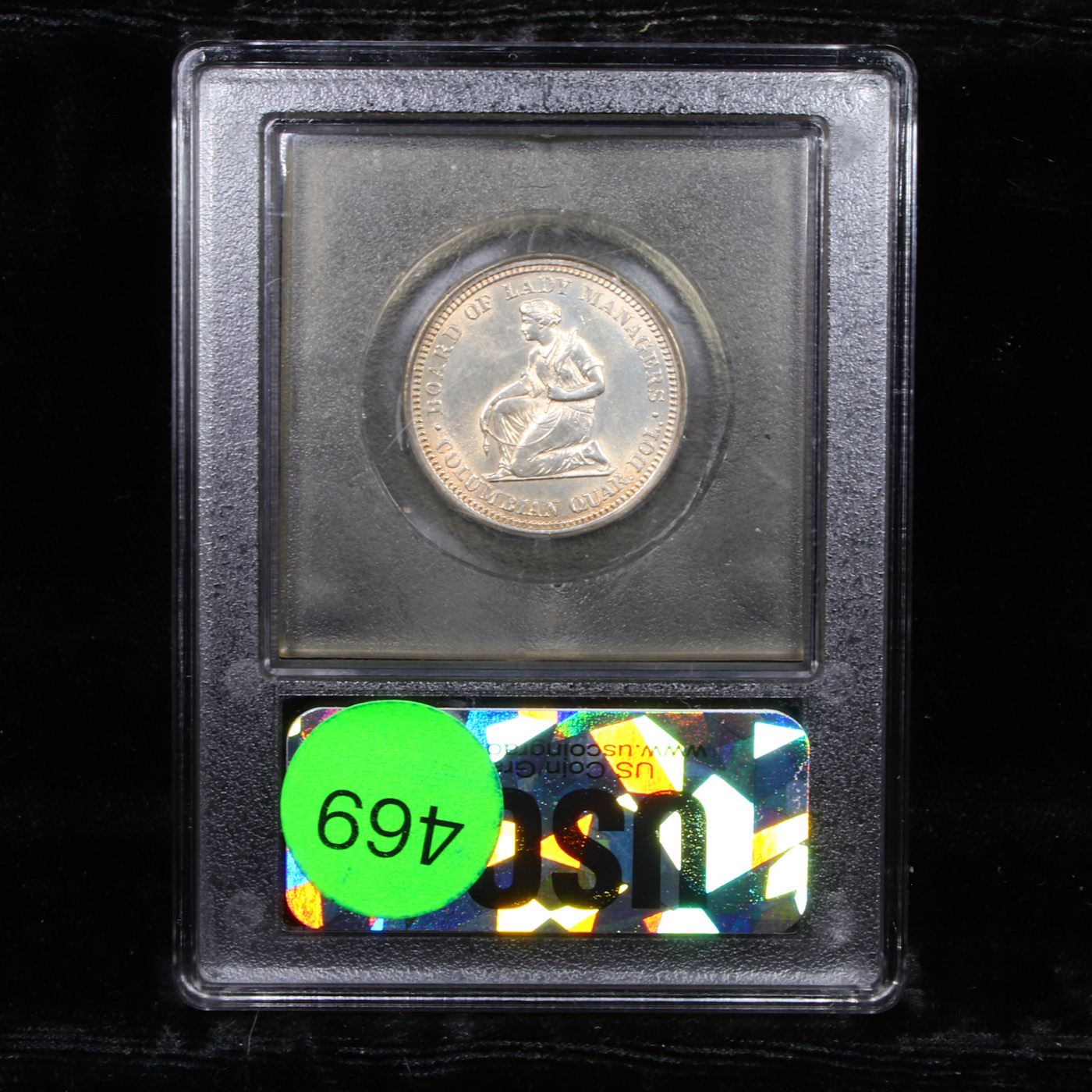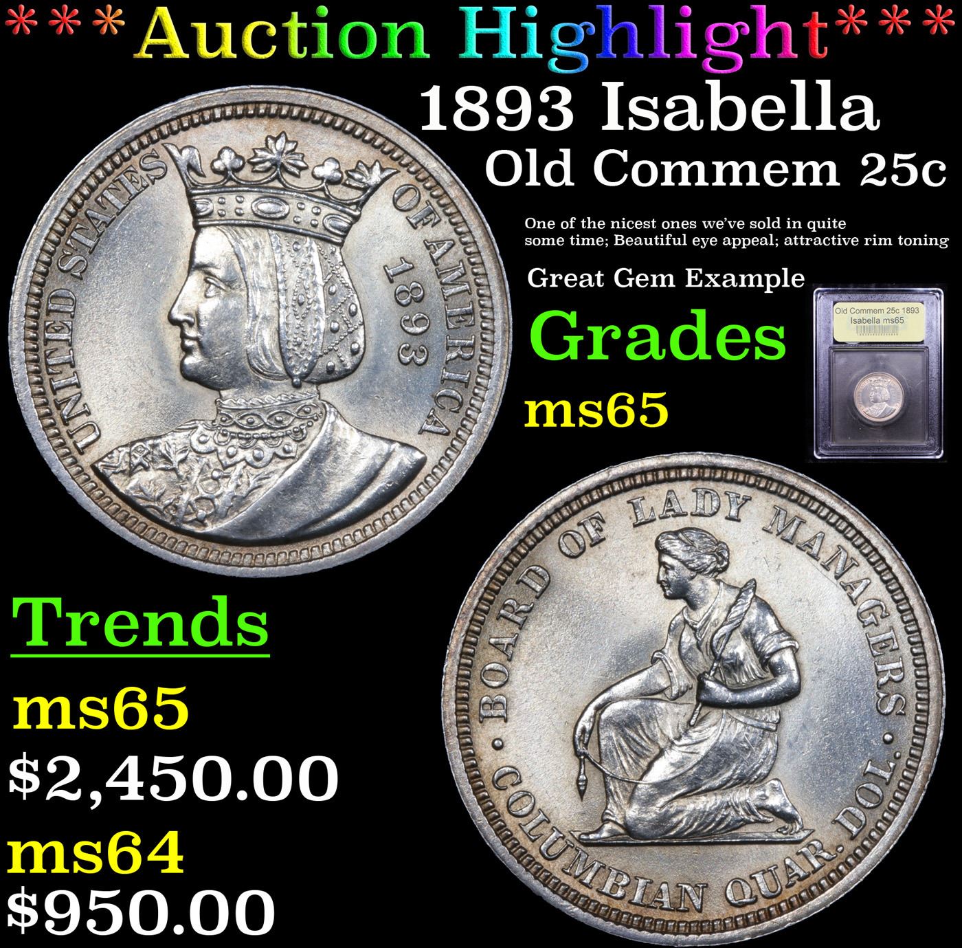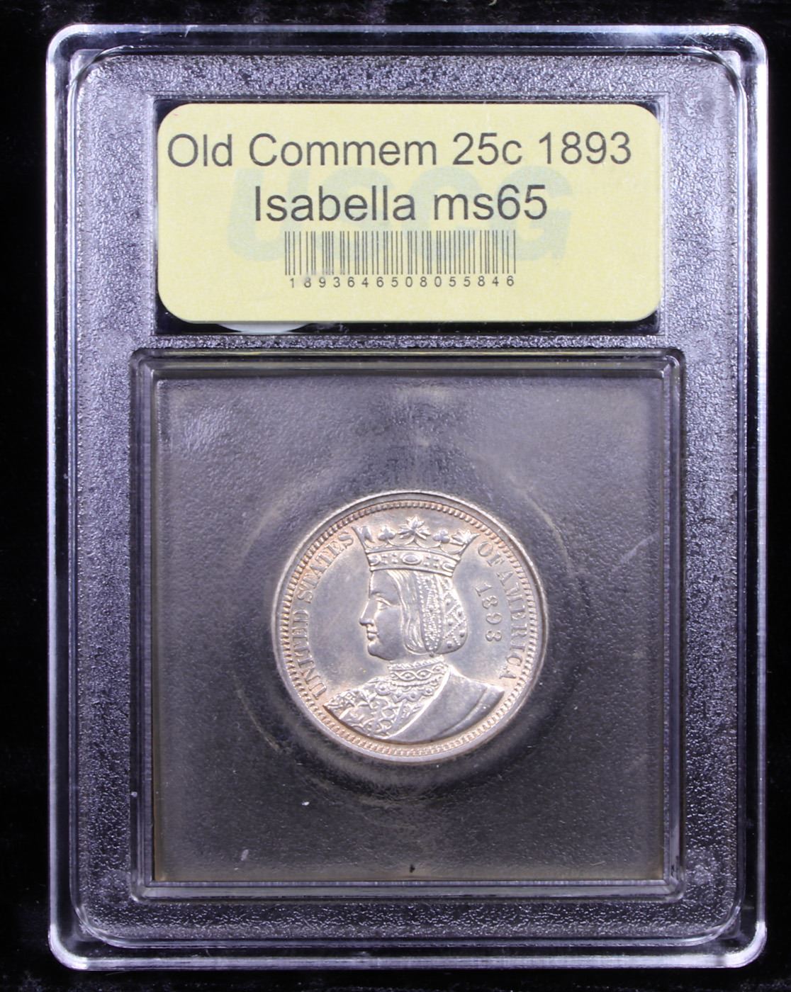 ***Auction Highlight*** 1893 Isabella Isabella Quarter 25c Graded GEM Unc By USCG. When Examining an Isabella Quarter on the Obverse, wear first shows in the area of the Crown’s Central Oval Jewel and on Isabella’s cheek. Reverse wear will first be noted on the Strand of Wool Resting on the Kneeling Spinner’s Thigh. Due to Die Wear, Raised or Sharp Definition of the Strand of Wool is not the norm. This area can display a Slight Weakness of Strike, which is par for the Design and should not be Labeled Wear. In January 1893, well after the Columbian half dollar was a reality, Mrs. Potter Palmer, well-known Chicago socialite, patron of the arts, and grande dame of the Exposition,[1] suggested to the Appropriations Committee of the House of Representatives that $10,000 of the money earmarked for the Board of Lady Managers of the World's Columbian Exposition be given in the form of a special issue of souvenir (as they were called) quarter dollars. This was translated into a law approved March 3, 1893, which stated that the production of these quarters would not exceed 40,000 and that the pieces would be of standard weight and fineness. Like the Columbian half dollars, the quarters would be made from metal taken from uncurrent silver coins held by the Treasury Department.The Board of Lady Managers had been formed at the insistence of Susan B. Anthony, who has determined that women should be adequately represented in the administration of the Exposition. Interestingly, there was also a Board of Gentlemen Managers, but this did not get much publicity, as it was taken for granted. The Board of Lady Managers took complete charge of the quarter-dollar project and stated that the coins were to have female motifs. Kenyon Cox, a well-known illustrator, was commissioned to prepare sketches, apparently furnishing motifs that were eventually modified by Charles E. Barber at the Mint. However, another artist, Caroline C. Peddle, one of Cox's former art students, was also heavily involved and furnished sketches, all of which were eventually rejected.[2] For the obverse, a depiction of Queen Isabella of Spain was suggested, for King Ferdinand and Queen Isabella furnished the financing for Columbus' voyage of discovery, Isabella vowing to pledge her crown and jewels if necessary (according to popular legend). In April 1893 the Treasury Department responded by submitting its own two obverse designs to the Board of Lady Managers, one sketch showing Isabella as a young queen (this was eventually chosen) and the other with a facing head of Isabella as an adult. Thus the Isabella quarter, as it was soon to be designated, became the first legal tender United States coin to depict a foreign monarch A Corey's Pick, Bid to Win, Don't let it get Away, you might not find its equal Coin