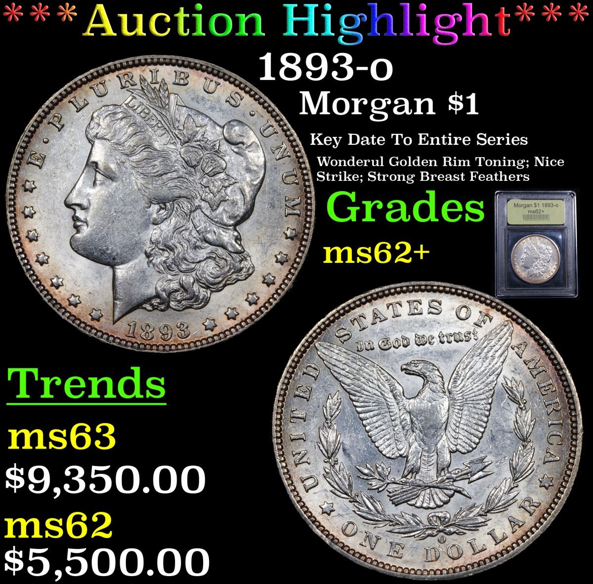 ***Auction Highlight*** 1893-o Morgan Dollar $1 Graded Select Unc By USCG. Up for auction is one of the absolute keys to the Morgan Dollar series, the 1893-o. Wonderful golden rim toning and strong luster highlight this outstanding key date Morgan. A nice strike with strong Breast heathers and well detailed devices throughout. Trends ms63 $9,350 ms62 $5,500 A Corey's Pick, Bid to Win, Don't let it get Away, you might not find its equal Coin