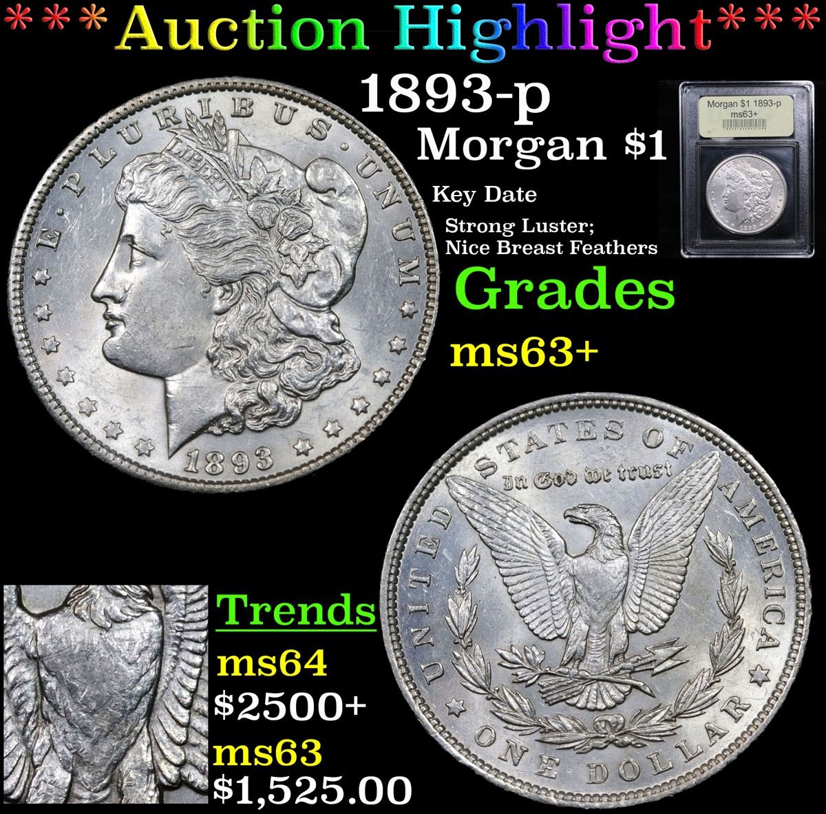 ***Auction Highlight*** 1893-p Key Date Strong Luster; Nice Breast Feathers Morgan Dollar $1 Graded Select+ Unc By USCG. A Corey's Pick, Bid to Win, Don't let it get Away Coin