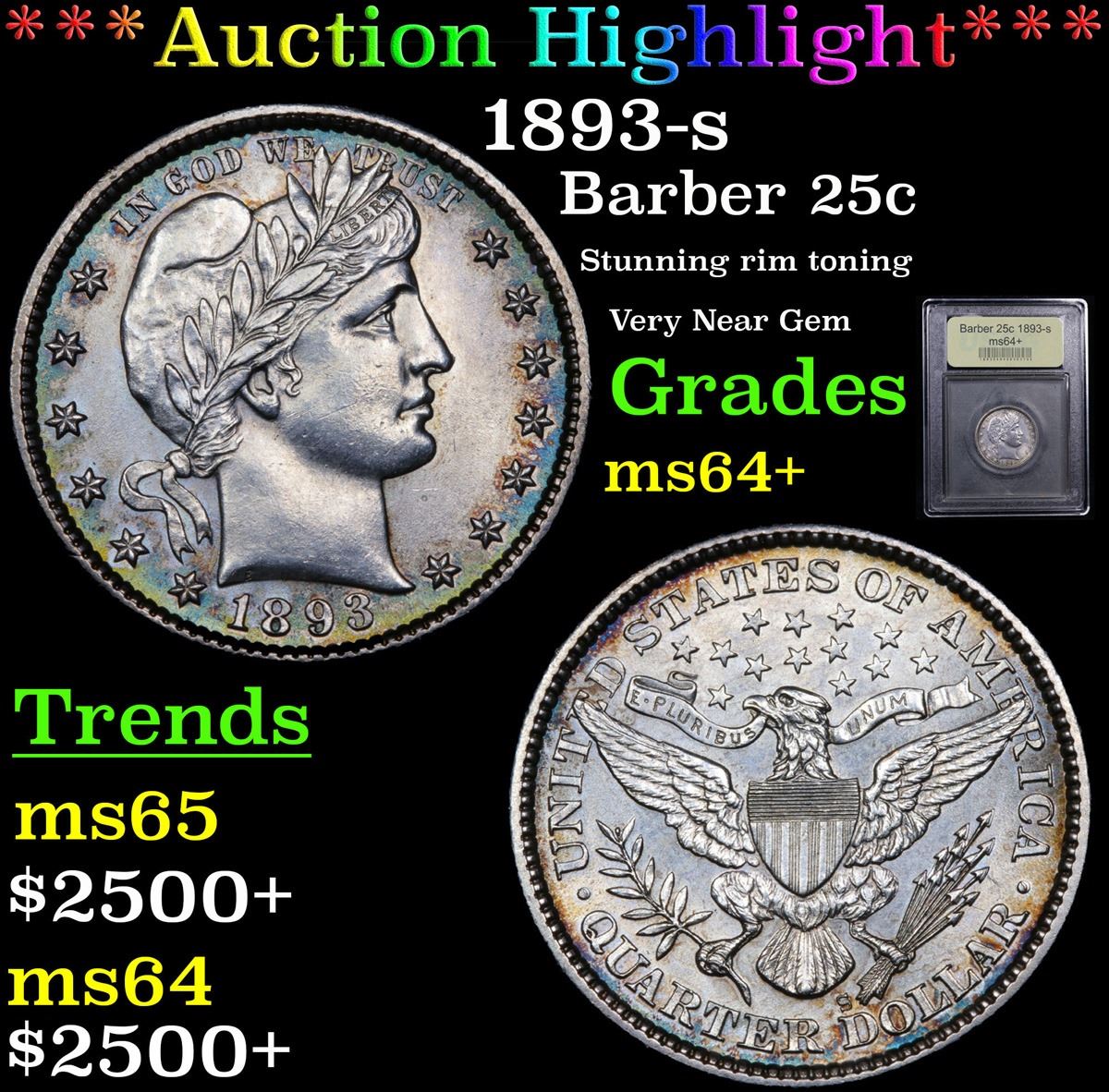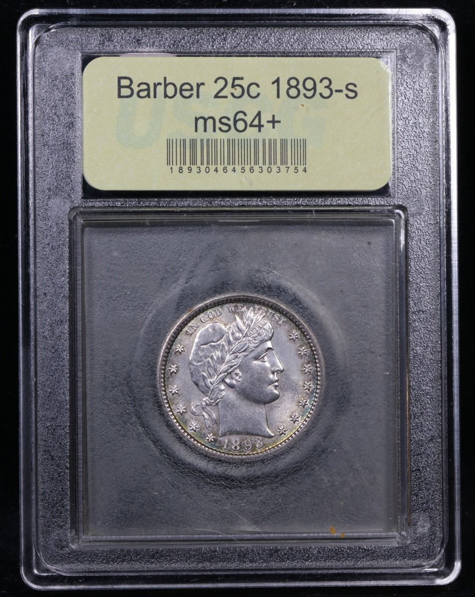 ***Auction Highlight*** 1893-s Barber Quarter 25c Graded Choice+ Unc By USCG. A more difficult and sought after Barber Quarter. A Corey's Pick, Bid to Win, Don't let it get Away, you might not find its equal Coin