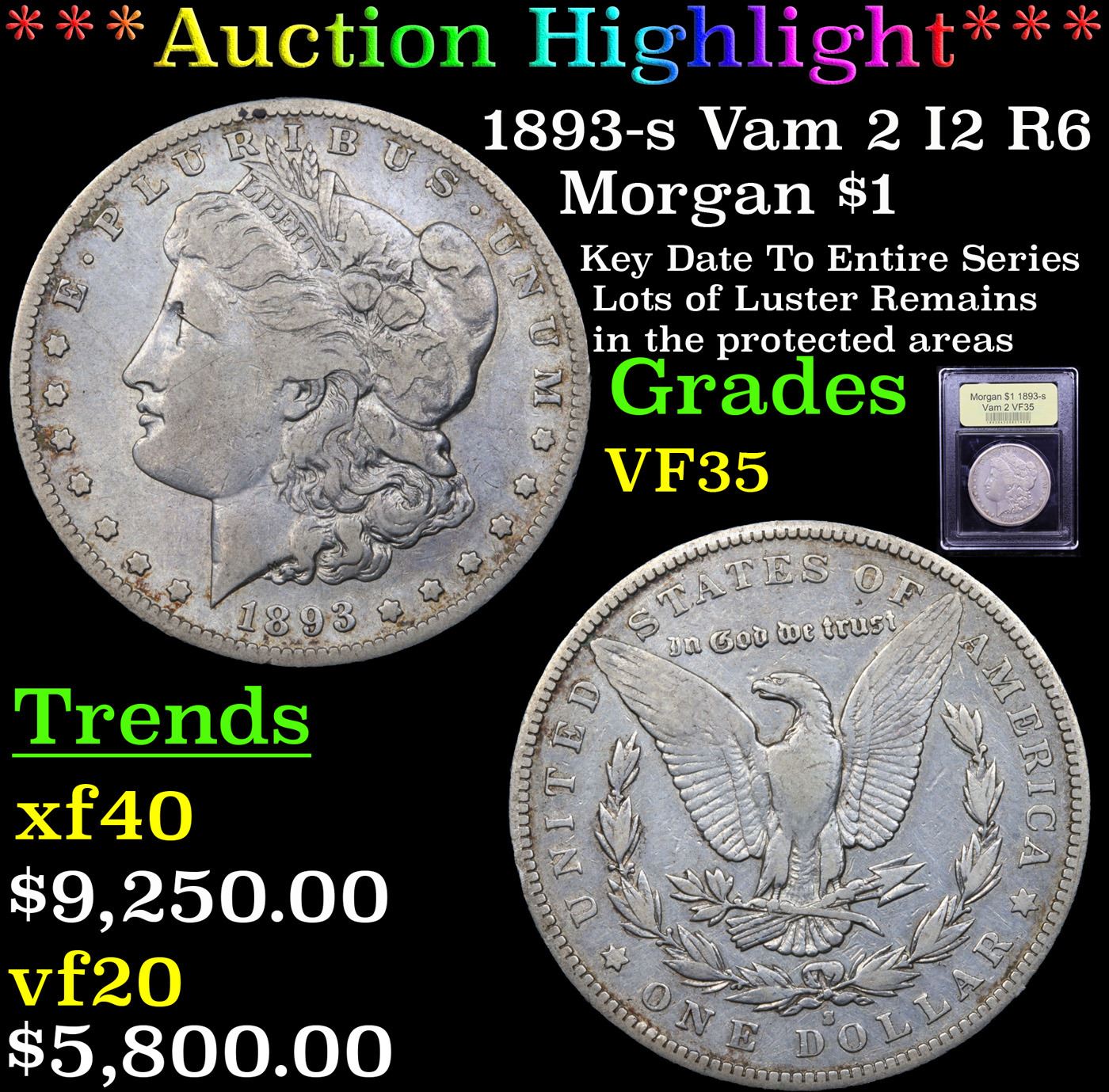 ***Auction Highlight*** 1893-s Vam 2 I2 R6 Morgan Dollar $1 Graded vf++ BY USCG. Pleasing silver gray surfaces retain significant amounts of original luster in the protected areas around the devices. Overall detail is suitably bold for a mid grade Morgan dollar, the eye appeal further enhanced by whispers of reddish-gold iridescence here and there around the peripheries. The key date 1893-S boasts the lowest circulation strike mintage in its series with just 100,000 coins produced, survivors eagerly sought in all grades. A Corey's Pick, Bid to Win, Don't let it get Away, you might not find its equal Coin. I give this coin my highest recommendation