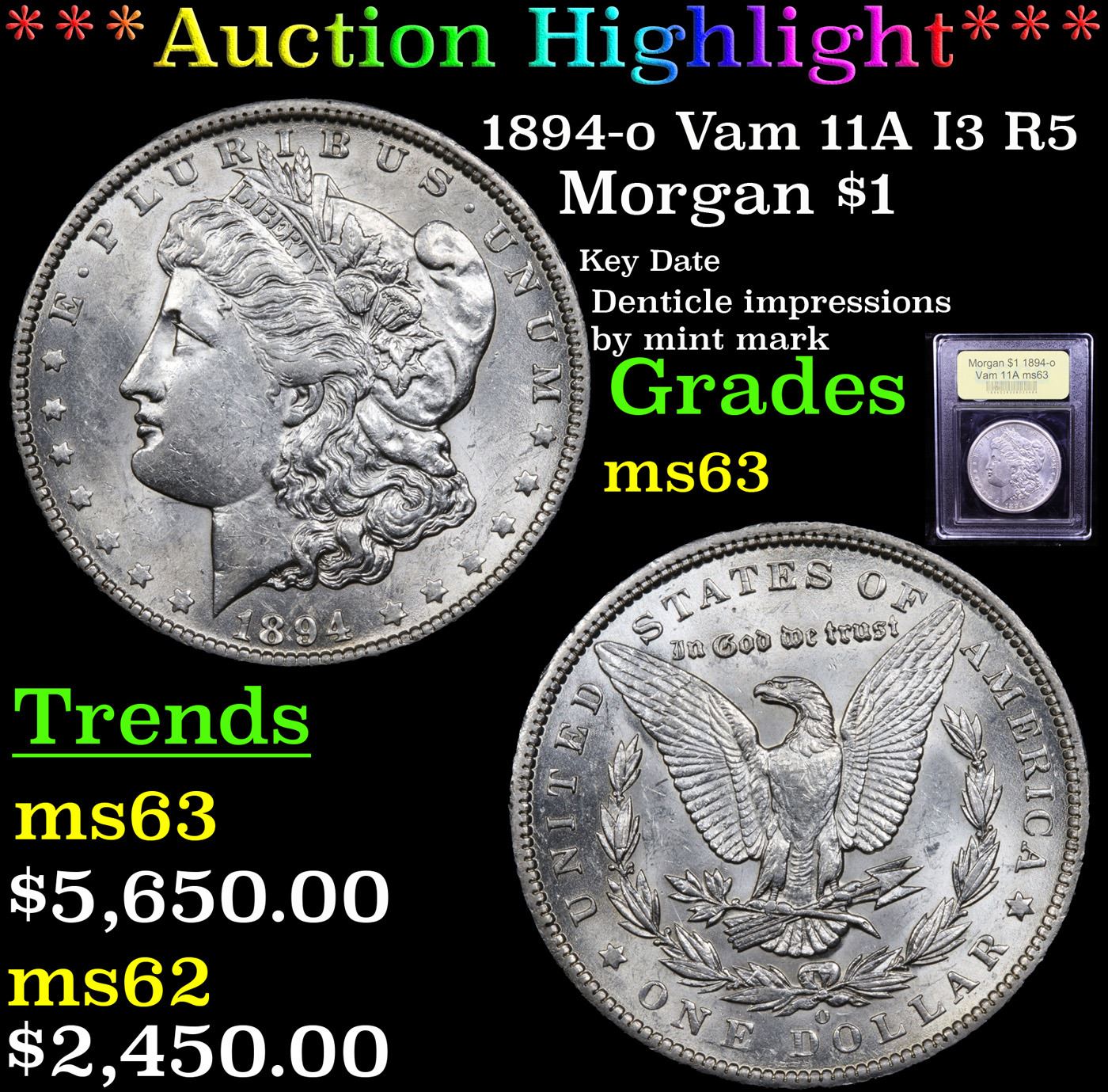 ***Auction Highlight*** 1894-o Vam 11A I3 R5 Morgan Dollar $1 Graded Select Unc By USCG. Up for Auction is a Key Date 1894-o. Silvery and untoned over minimally abraded surfaces, this appealing coin is worthy of a strong bid. A true condition rarity among Morgan dollars, the 1894-O is readily obtainable in worn condition yet scarce to rare in all Mint State grades. When we further consider that most Uncirculated survivors of this 1,723,000-piece issue are poorly struck with inferior luster, the present offering is sure to catch the eye of the discerning Morgan dollar collector. A Corey's Pick, Bid to Win, Don't let it get Away, you might not find its equal Coin. I give this coin my highest recommendation