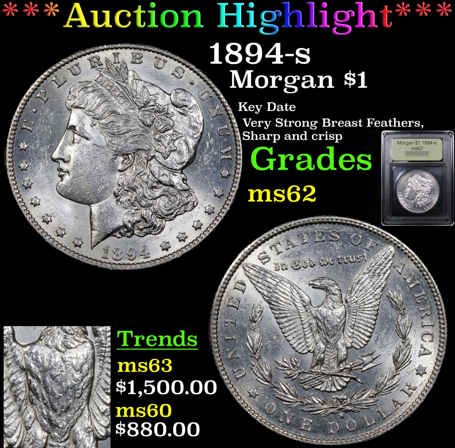 ***Auction Highlight*** 1894-s Key Date Very Strong Breast Feathers, Sharp and crisp Morgan Dollar $1 Graded Select Unc By USCG. A Corey's Pick, Bid to Win, Don't let it get Away Coin