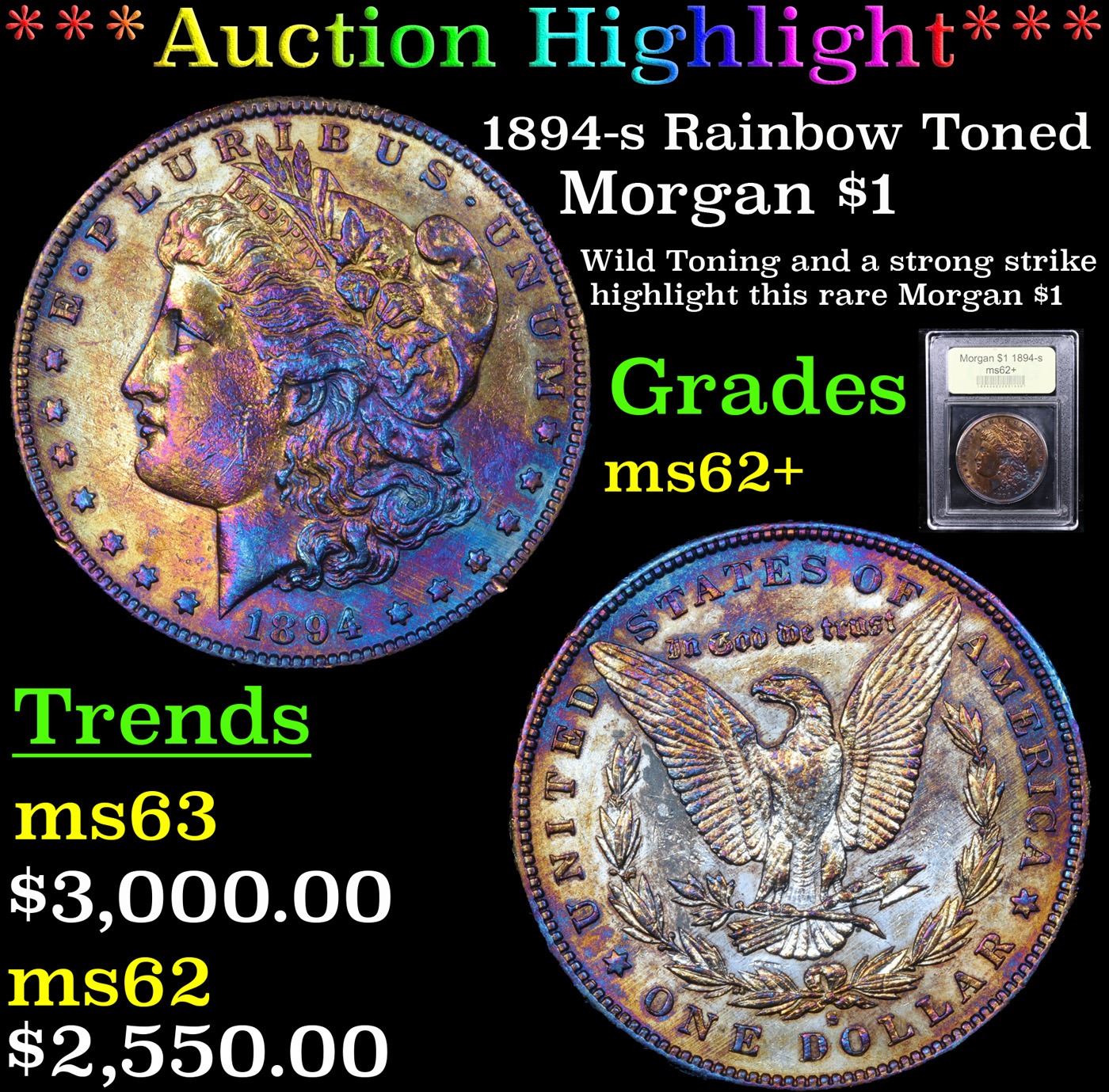 ***Auction Highlight*** 1894-s Rainbow Toned Morgan Dollar $1 Graded Select Unc By USCG. A boldly lustrous Mint State Morgan dollar with widely sweeping cartwheel activity on Flashy and mildly reflective surfaces. Wild Colorful tones engage both sides, a brief glance reveals screams of blue, gold and rose iridescence. The strike is strong throughout and the eye appeal should appeal to those who enjoy toned Morgans. Like most coins from the San Francisco Mint, the 1894-S dollars produced saw much use in commerce in the West. Circulated examples are available in today's numismatic marketplace, but the number of Mint State coins is certainly tiny in comparison. A Corey's Pick, Bid to Win, Don't let it get Away, you might not find its equal Coin