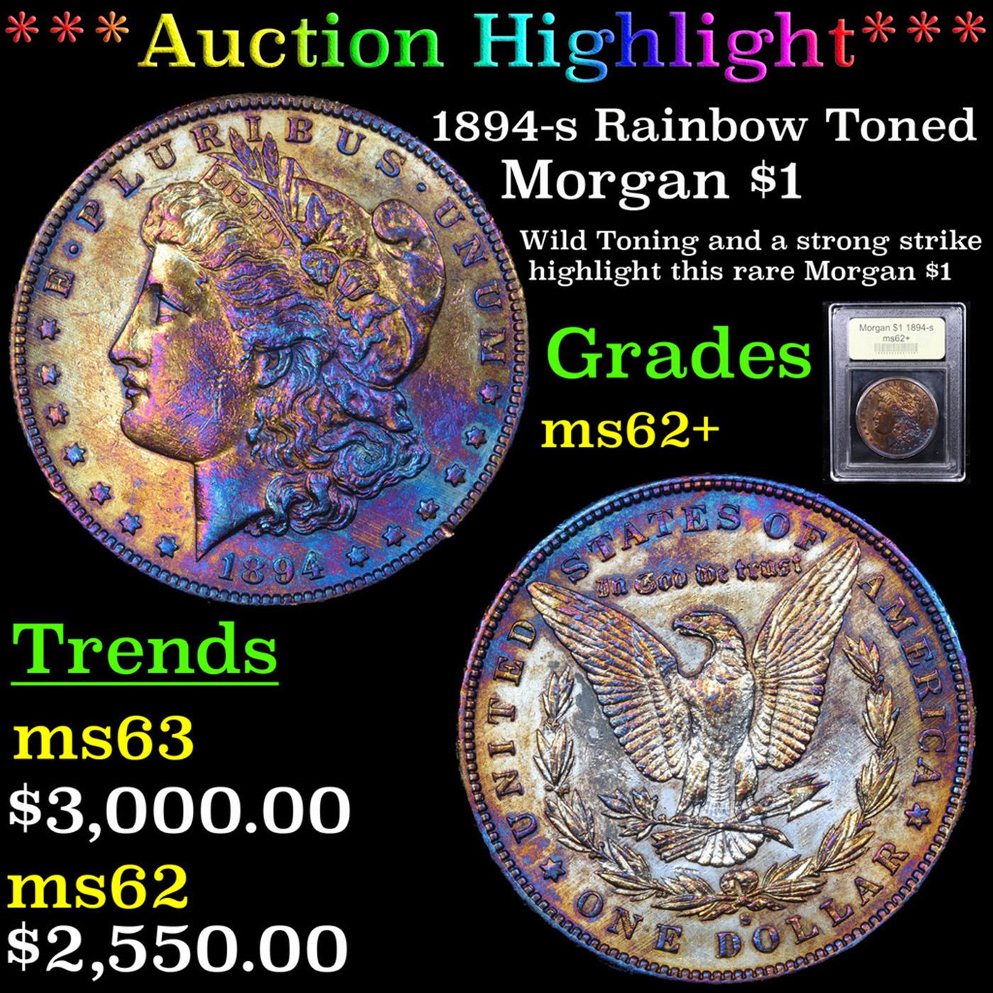 ***Auction Highlight*** 1894-s Rainbow Toned Morgan Dollar 1 Graded Select Unc By USCG. A boldly lustrous Mint State Morgan dollar with widely sweeping cartwheel activity on Flashy and mildly reflective surfaces. Wild Colorful tones engage both sides, a brief glance reveals screams of blue, gold and rose iridescence. The strike is strong throughout and the eye appeal should appeal to those who enjoy toned Morgans. Like most coins from the San Francisco Mint, the 1894-S dollars produced saw much use in commerce in the West. Circulated examples are available in today's numismatic marketplace, but the number of Mint State coins is certainly tiny in comparison. A Corey's Pick, Bid to Win, Don't let it get Away, you might not find its equal Coin