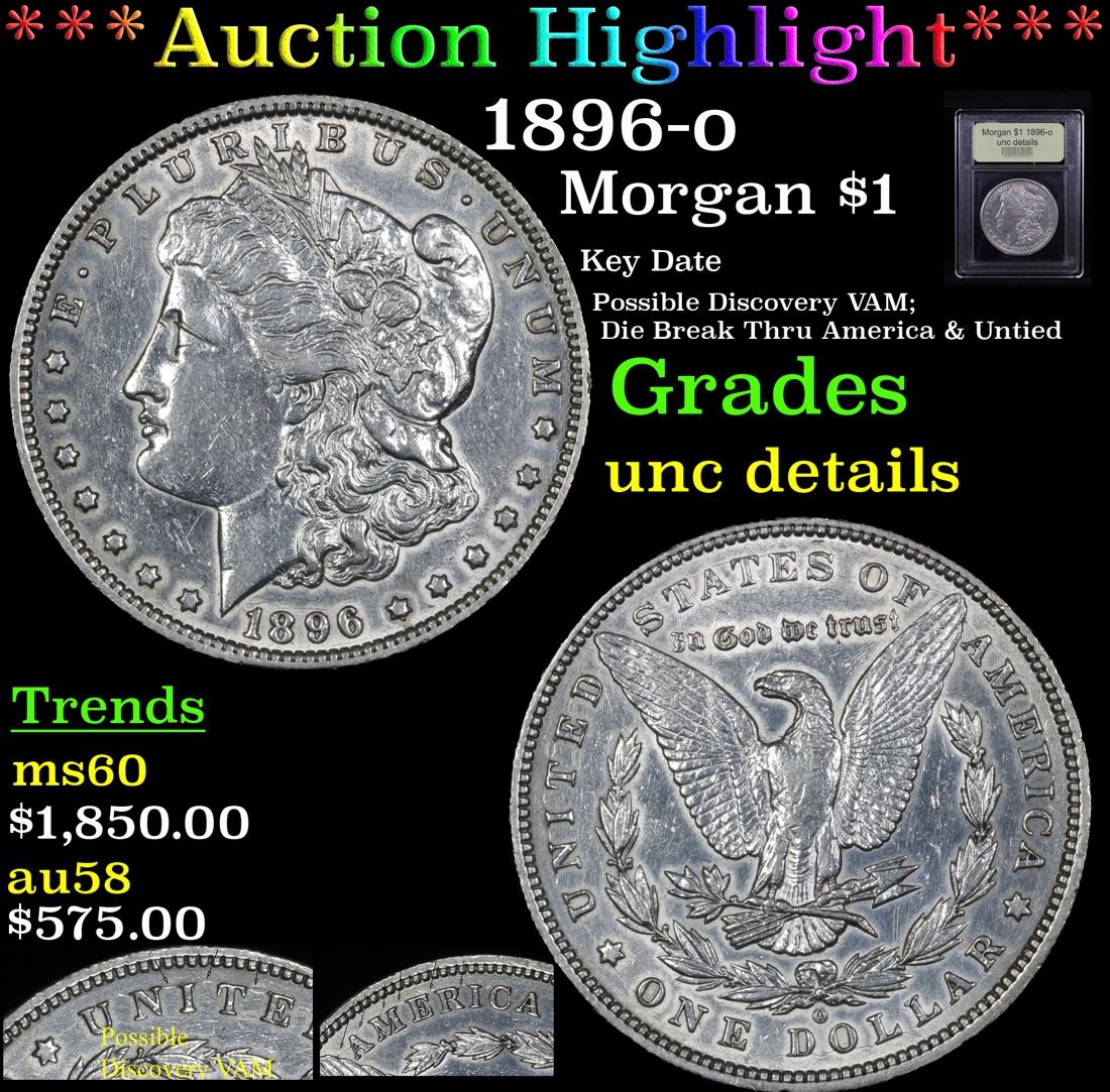 ***Auction Highlight*** 1896-o Key Date Possible Discovery VAM; Die Break Thru America & Untied Morgan Dollar $1 Graded Unc Details By USCG. Possible Discorevy Vam Huge Die Beark Through United And America. Not Listed As Varity Should Send Off To Leroy For Verification