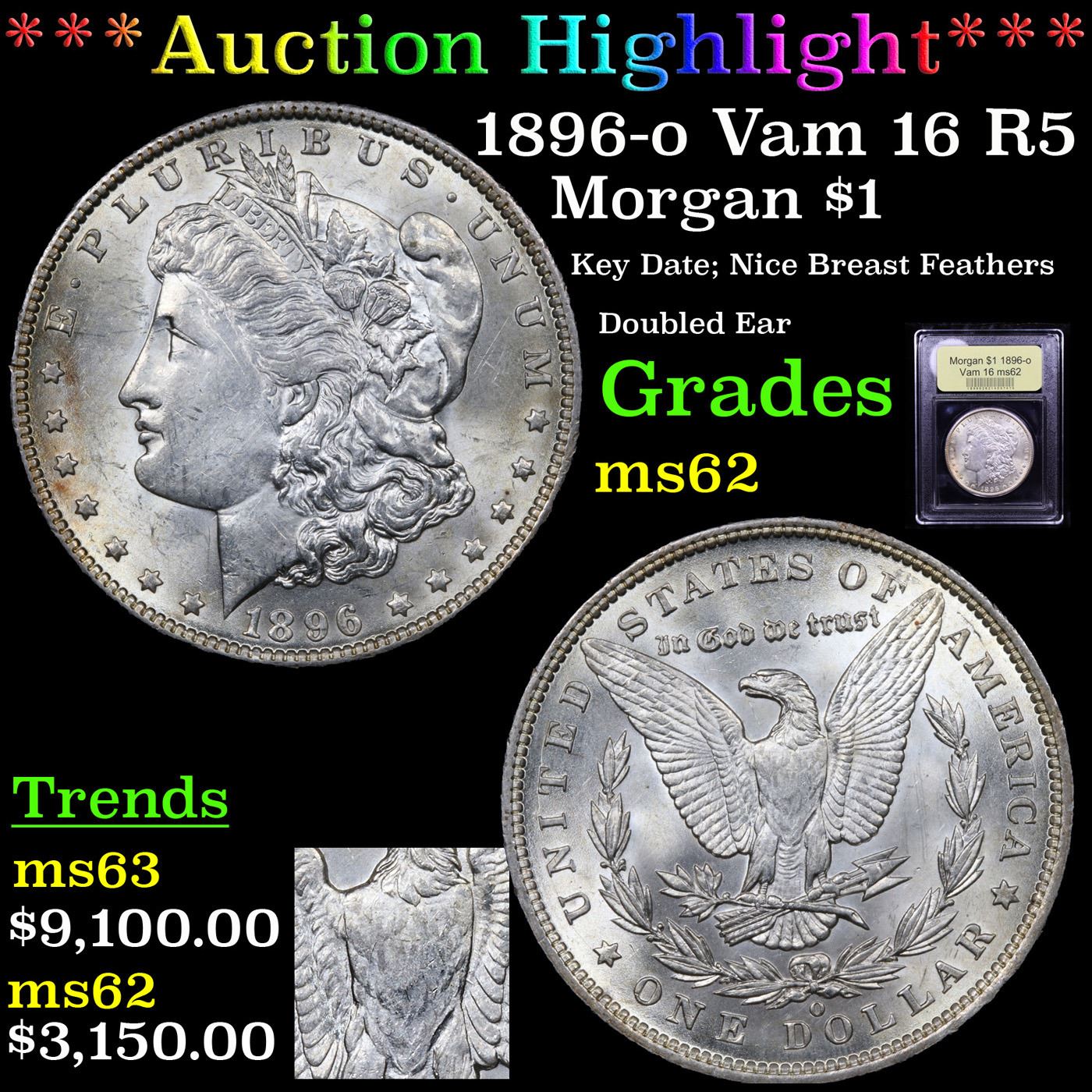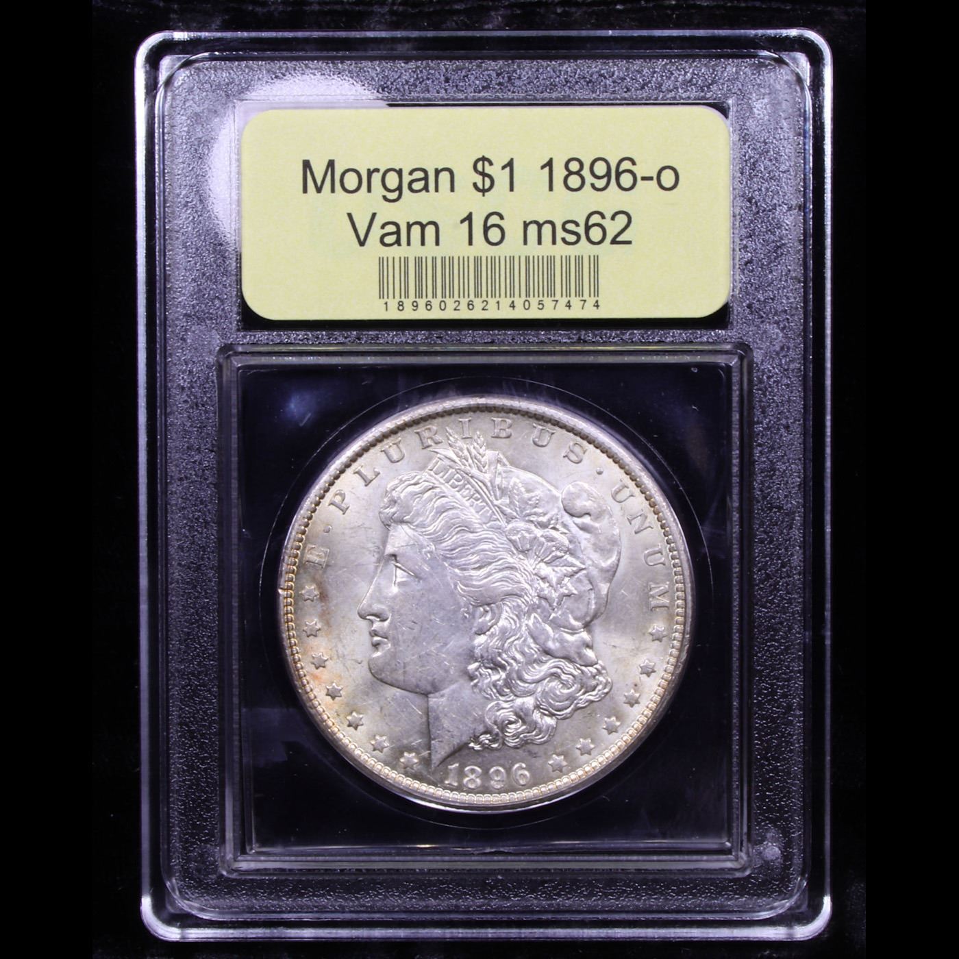 ***Auction Highlight*** 1896-o Vam 16 R5 Morgan Dollar $1 Graded Select Unc By USCG. Up for Auction is a Key Date 1896-o. Silvery and lightly toned obverse and fully untoned reverse. Minimally abraded surfaces, this appealing coin is worthy of a strong bid. A true condition rarity among Morgan dollars, the 1896-O is readily obtainable in worn condition yet scarce to rare in all Mint State grades. When we further consider that most Uncirculated survivors of this 4,900,000-piece issue are poorly struck with inferior luster, the present offering is sure to catch the eye of the discerning Morgan dollar collector. A Corey's Pick, Bid to Win, Don't let it get Away, you might not find its equal Coin