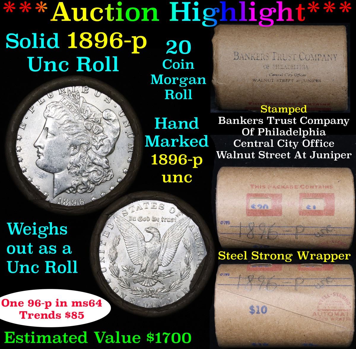 ***Auction Highlight*** 1896-p Uncirculated Morgan Dollar Shotgun Roll. This roll is held in an old Steel strong wrapper, patented 1921, stamped "Bankers Trust Company of Philadelphia, Walnut Street at Juniper. 1896-p Uncirculated Morgan Dollar Roll, Superb Ends. Weighs Perfectly as an Uncirculated Roll.