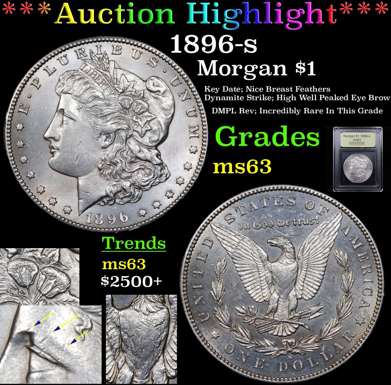 ***Auction Highlight*** 1896-s Key Date; Nice Breast Feathers Dynamite Strike; High Well Peaked Eye Brow DMPL Rev; Incredibly Rare In This Grade Morgan Dollar $1 Graded Select Unc By USCG. 0