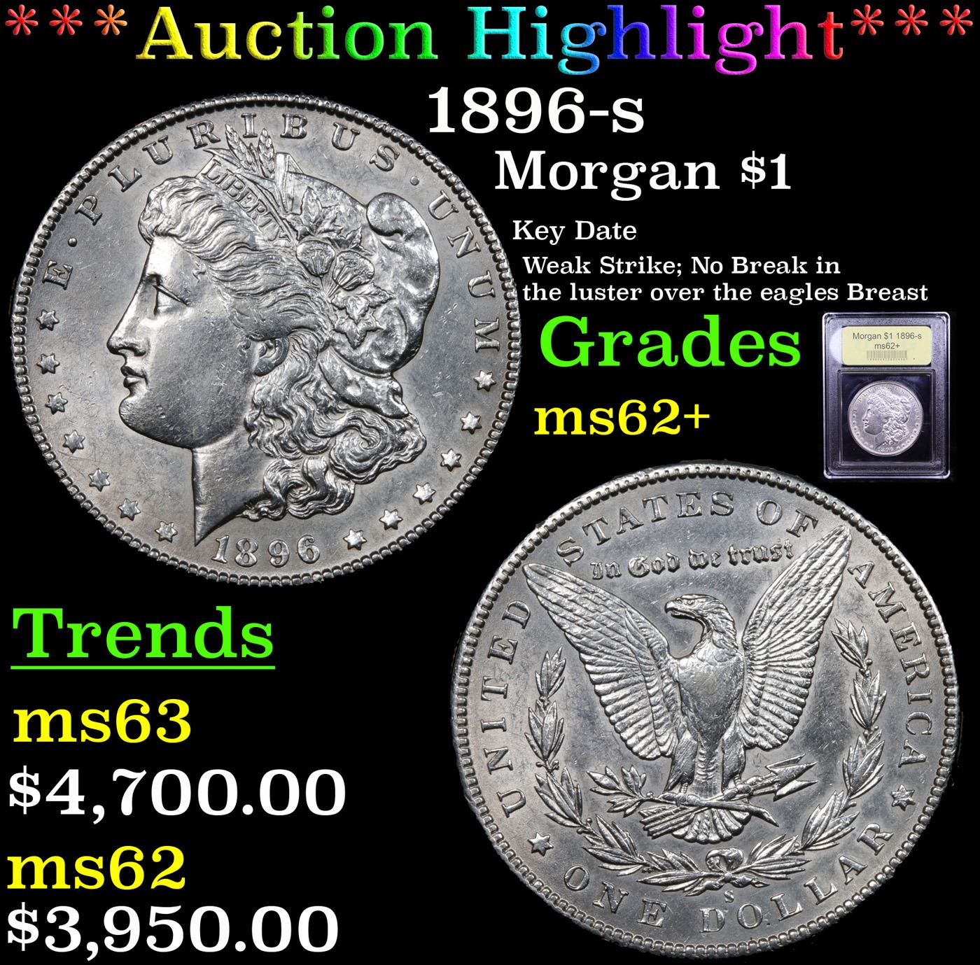 ***Auction Highlight*** 1896-s Morgan Dollar $1 Graded Select Unc By USCG. This is a smartly impressed, highly lustrous example showing weakness in the reverse center. Lacing any appreciable toning, the surfaces remain silver-grey and quite smooth for the grade. Much more challenging to locate in all Mint State grades than a sizeable mintage of 5 million coins might imply, the 1896-S is one of the scarcer entries in the San Francisco Mint Morgan dollar series. This satiny beauty would do nicely in an advanced collection. A Corey's Pick, Bid to Win, Don't let it get Away, you might not find its equal Coin. I give this coin my highest recommendation