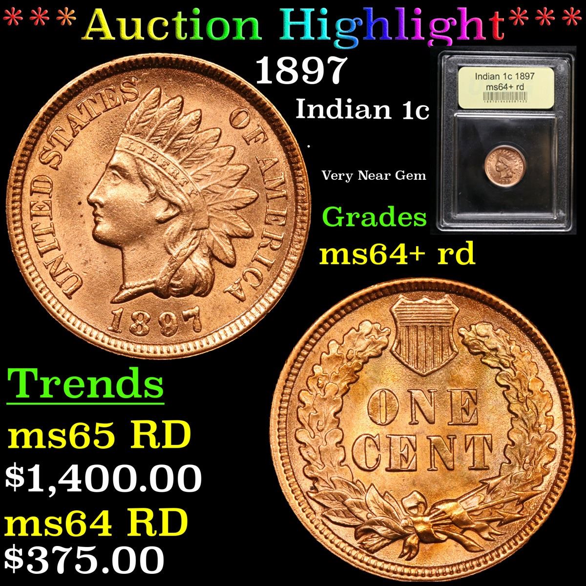 ***Auction Highlight*** 1897 . Very Near Gem Indian Cent 1c Graded Choice+ Unc RD By USCG. A Corey's Pick, Bid to Win, Don't let it get Away Coin