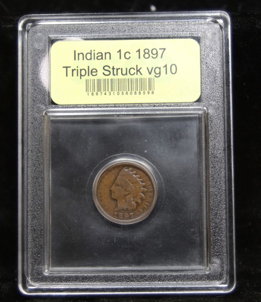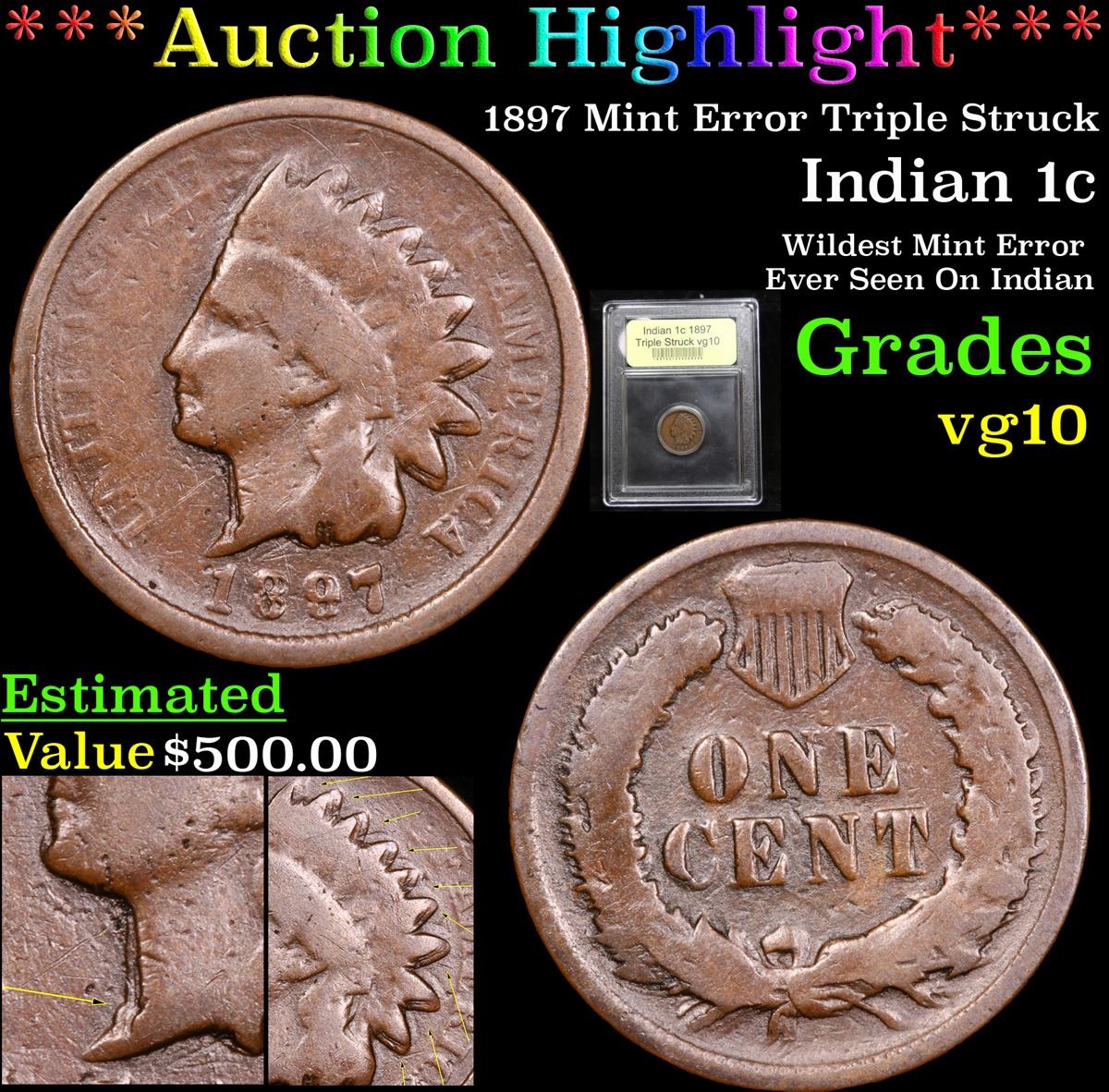***Auction Highlight*** 1897 Mint Error Triple Struck Wildest Mint Error Ever Seen On Indian . Indian Cent 1c Graded vg+ By USCG. A Corey's Pick, Bid to Win, Don't let it get Away, you might not find its equal Coin