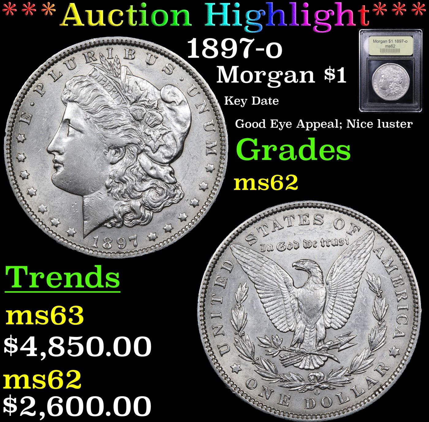 ***Auction Highlight*** 1897-o Morgan Dollar $1 Graded Select Unc By USCG. Up for Auction is a Key Date 1897-o. Silvery and untoned over minimally abraded surfaces, this appealing coin is worthy of a strong bid. A true condition rarity among Morgan dollars, the 1897-O is readily obtainable in worn condition yet scarce to rare in all Mint State grades. When we further consider that most Uncirculated survivors of this 4,004,000-piece issue are poorly struck with inferior luster, the present offering is sure to catch the eye of the discerning Morgan dollar collector. A Corey's Pick, Bid to Win, Don't let it get Away, you might not find its equal Coin