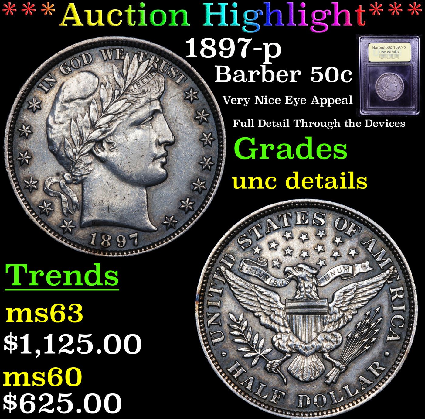 ***Auction Highlight*** 1897-p Barber Half Dollars 50c Graded Unc Details By USCG.