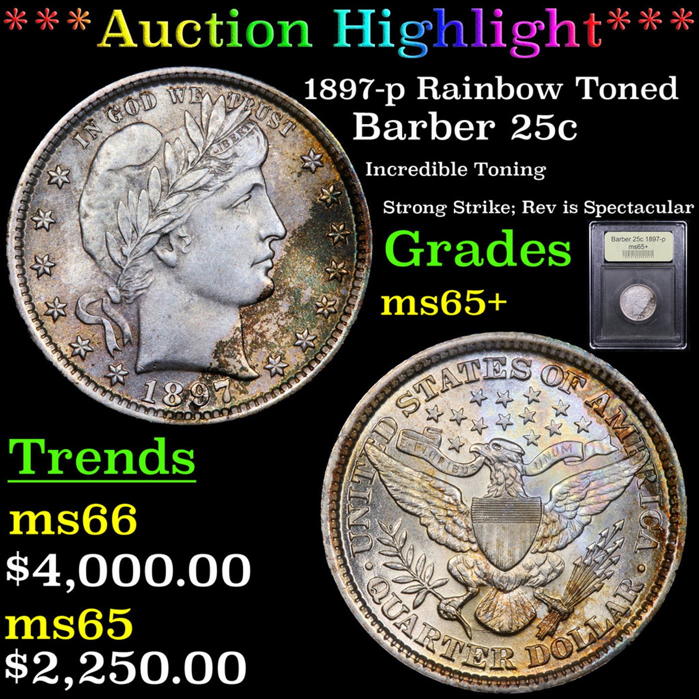 ***Auction Highlight*** 1897-p Rainbow Toned Barber Quarter 25c Graded GEM+ Unc By USCG. A Corey's Pick, Bid to Win, Don't let it get Away, you might not find its equal Coin