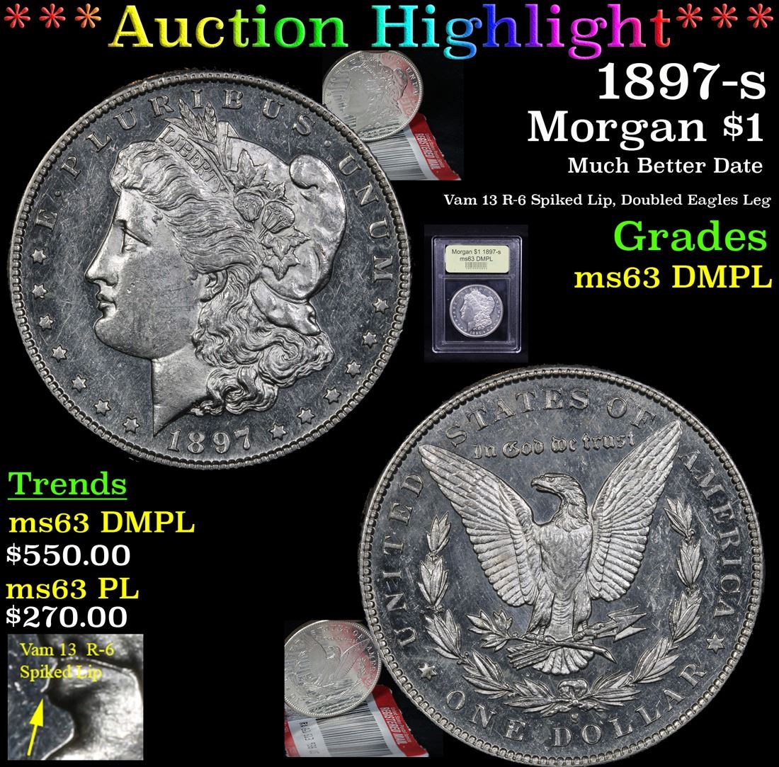 ***Auction Highlight*** 1897-s Much Better Date Vam 13 R-6 Spiked Lip, Doubled Eagles Leg Morgan Dollar $1 Graded Select Unc DMPL By USCG. A Corey's Pick, Bid to Win Coin