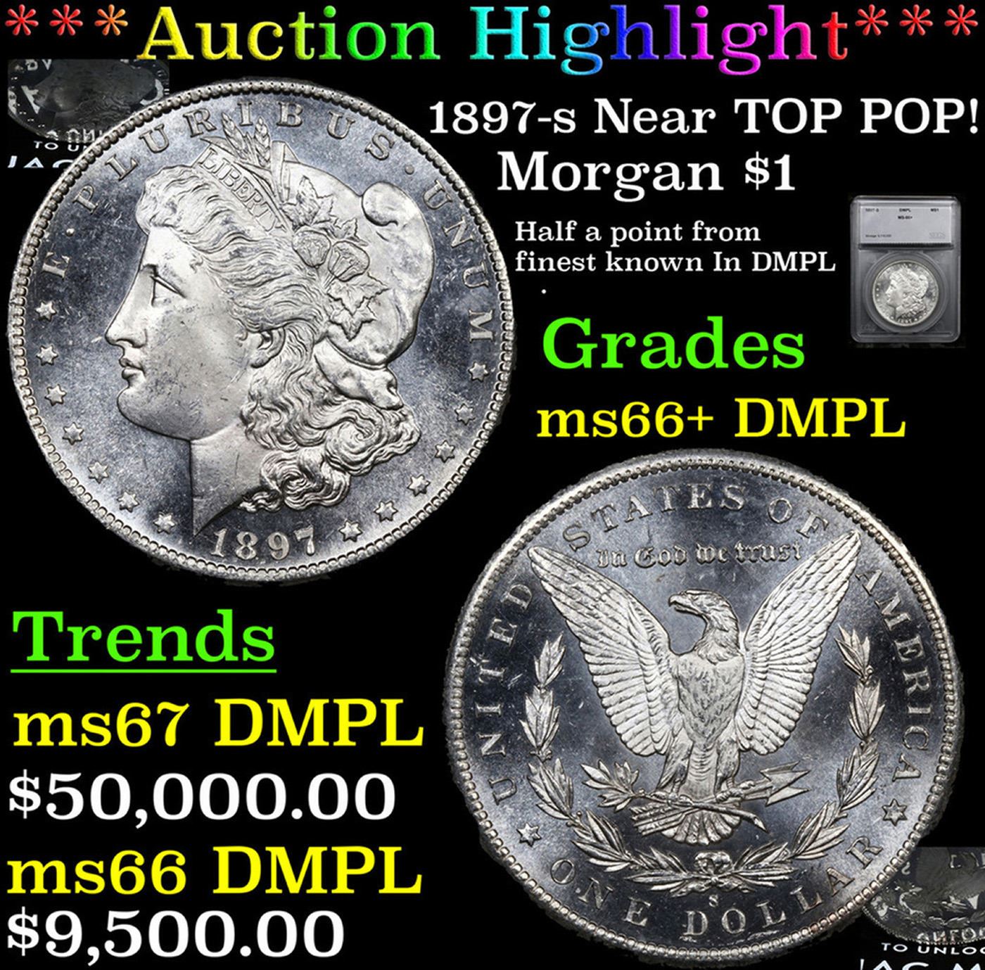***Auction Highlight*** 1897-s Near TOP POP! Morgan Dollar $1 Graded ms66+ DMPL By SEGS. A Corey's Pick, Bid to Win, Don't let it get Away, you might not find its equal Coin. I give this coin my highest recommendation