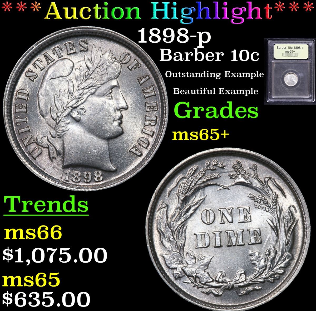 ***Auction Highlight*** 1898-p Outstanding Example Beautiful Example Barber Dime 10c Graded GEM+ Unc By USCG. A Corey's Pick, Bid to Win, Don't let it get Away, you might not find its equal Coin