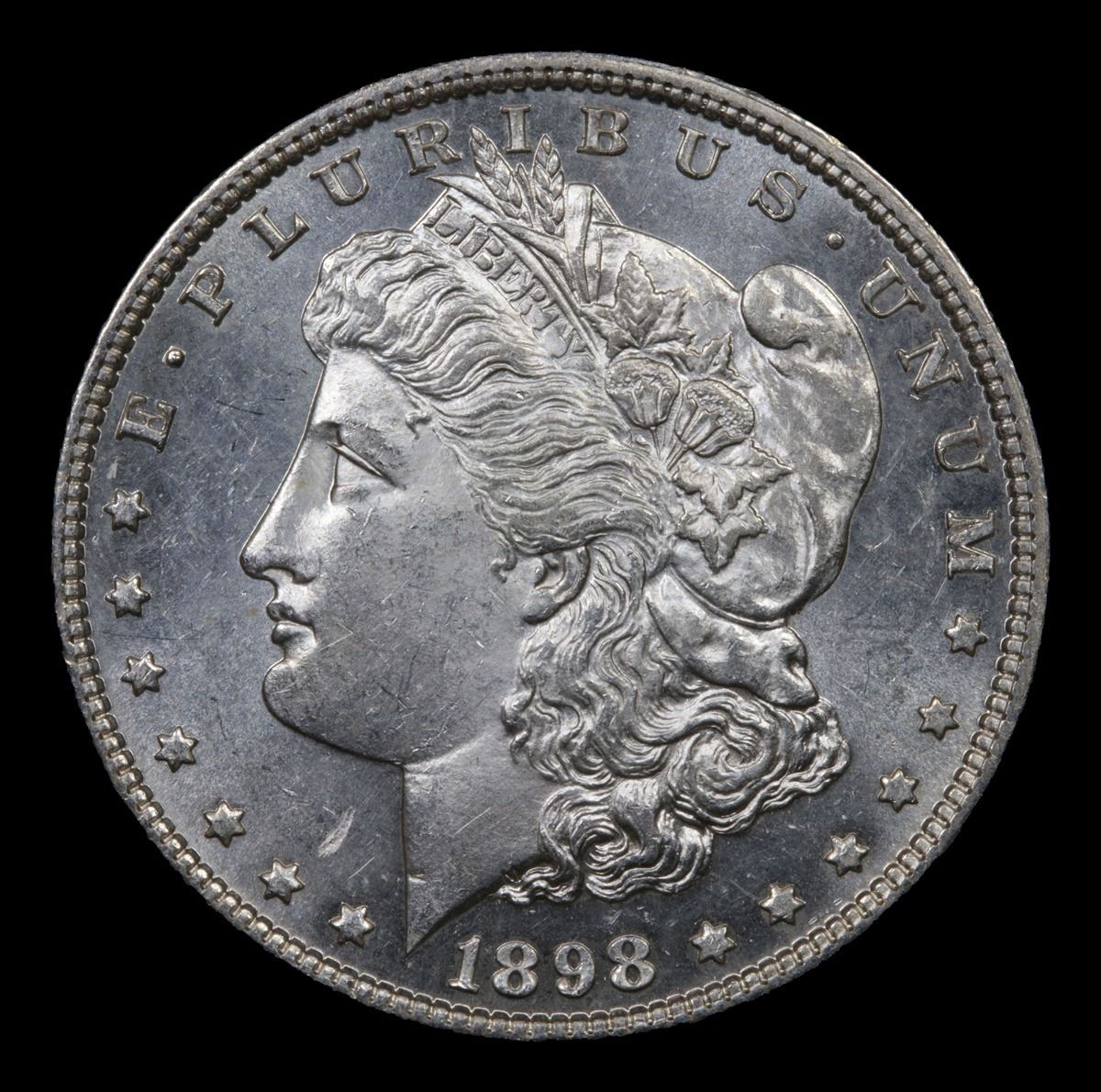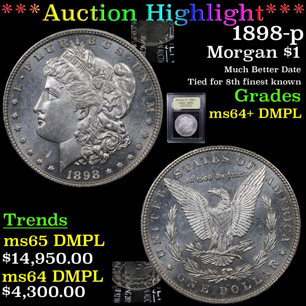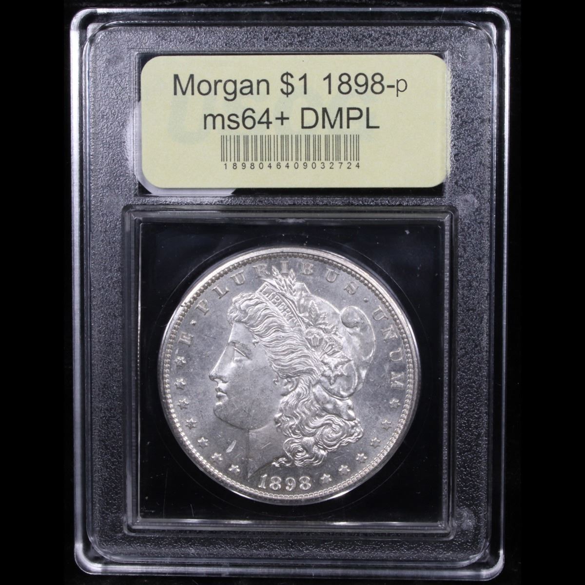 ***Auction Highlight*** 1898-p Morgan Dollar $1 Graded Choice Unc+ DMPL BY uSCG. Few 1898-p Morgan dollars exhibit proof like surfaces, and even fewer can boast of a Deep Mirror Proof like designation. This near-Gem Morgan dollar is designated as a Deep Mirror Proof like, with deeply mirrored fields and lustrous devices. This piece is brilliant and lacks toning on either side with minimal marks. A Corey's Pick, Bid to Win, Don't let it get Away, you might not find its equal Coin. I give this coin my highest recommendation