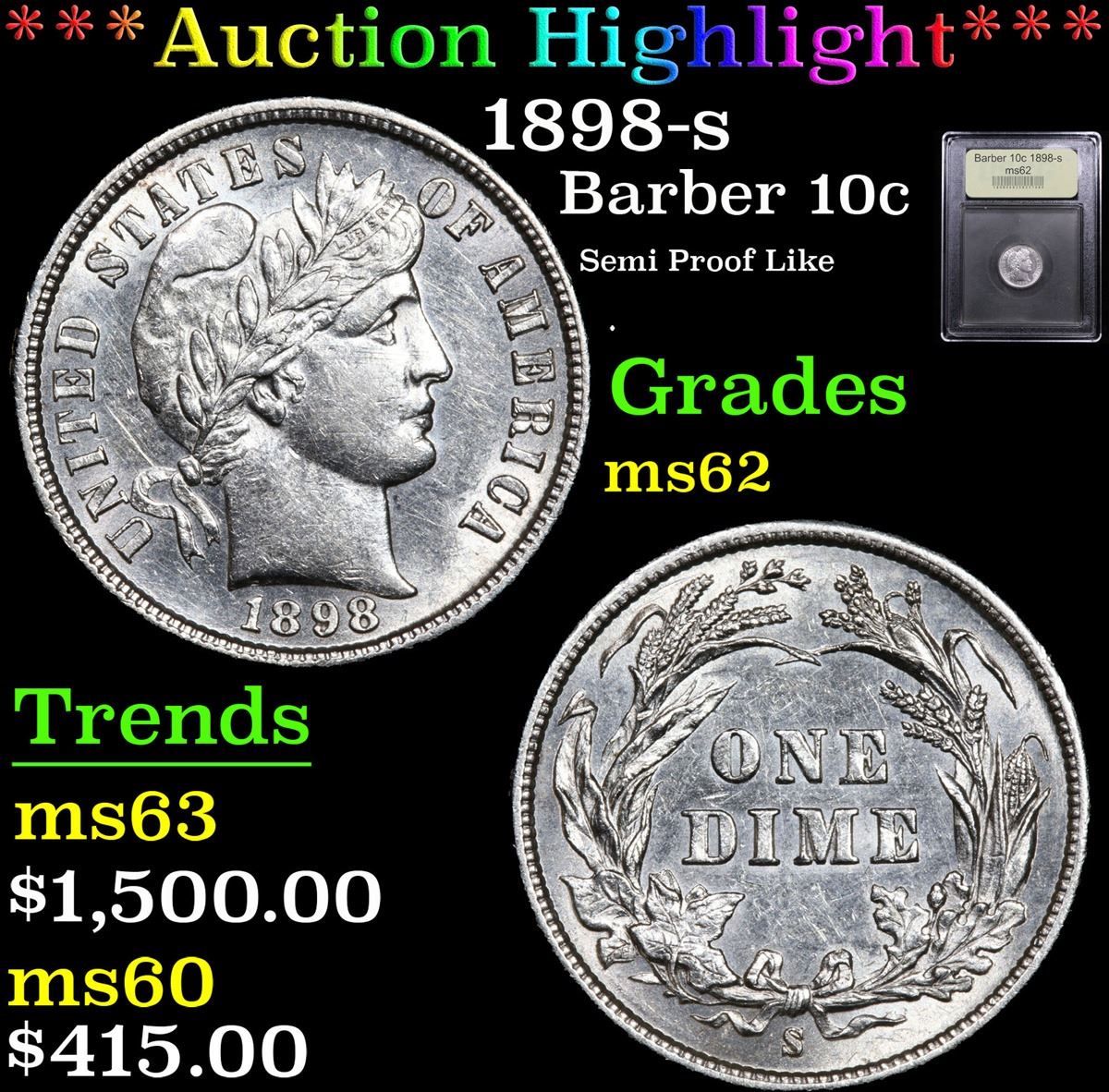 ***Auction Highlight*** 1898-s Semi Proof Like . Barber Dime 10c Graded Select Unc By USCG. A rare and better date Barber Dime. A Corey's Pick