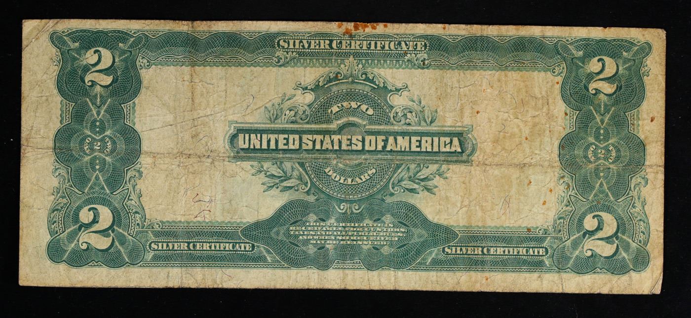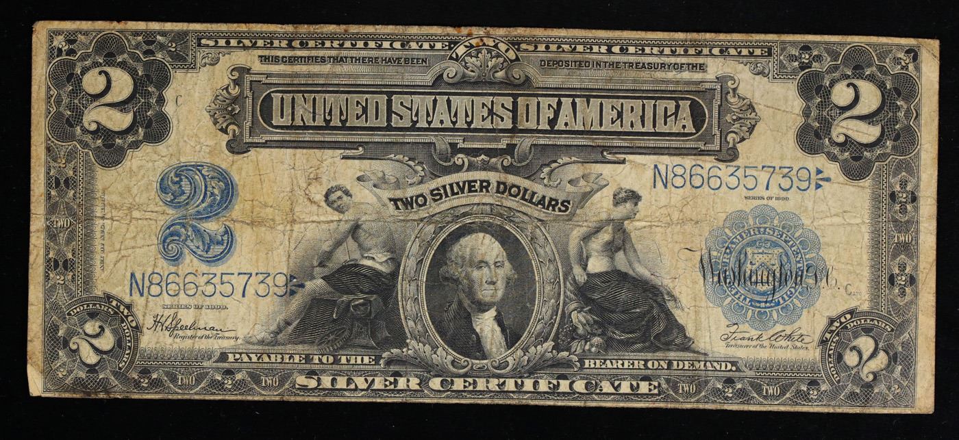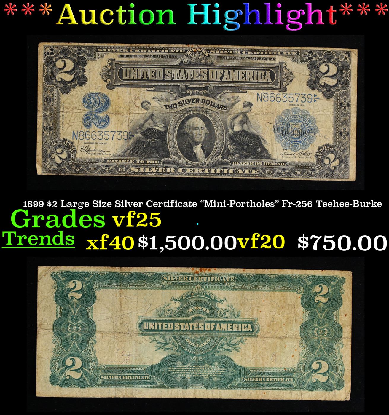 ***Auction Highlight*** 1899 $2 Large Size Silver Certificate "Mini-Portholes" Fr-256 Teehee-Burke Grades vf+. The Series 1899 $2 Silver Certificate is notable not only for being the last $2 silver certificate series printed, but also because it is the only $2 bill to feature a portrait of George Washington instead of the more common Thomas Jefferson image. Because Washington’s portrait on the bill’s face is small and surrounded by an oval frame resembling a ship’s porthole, collectors have named it the “Mini-Porthole” bill. A Key Date's Pick, Bid to Win Coin