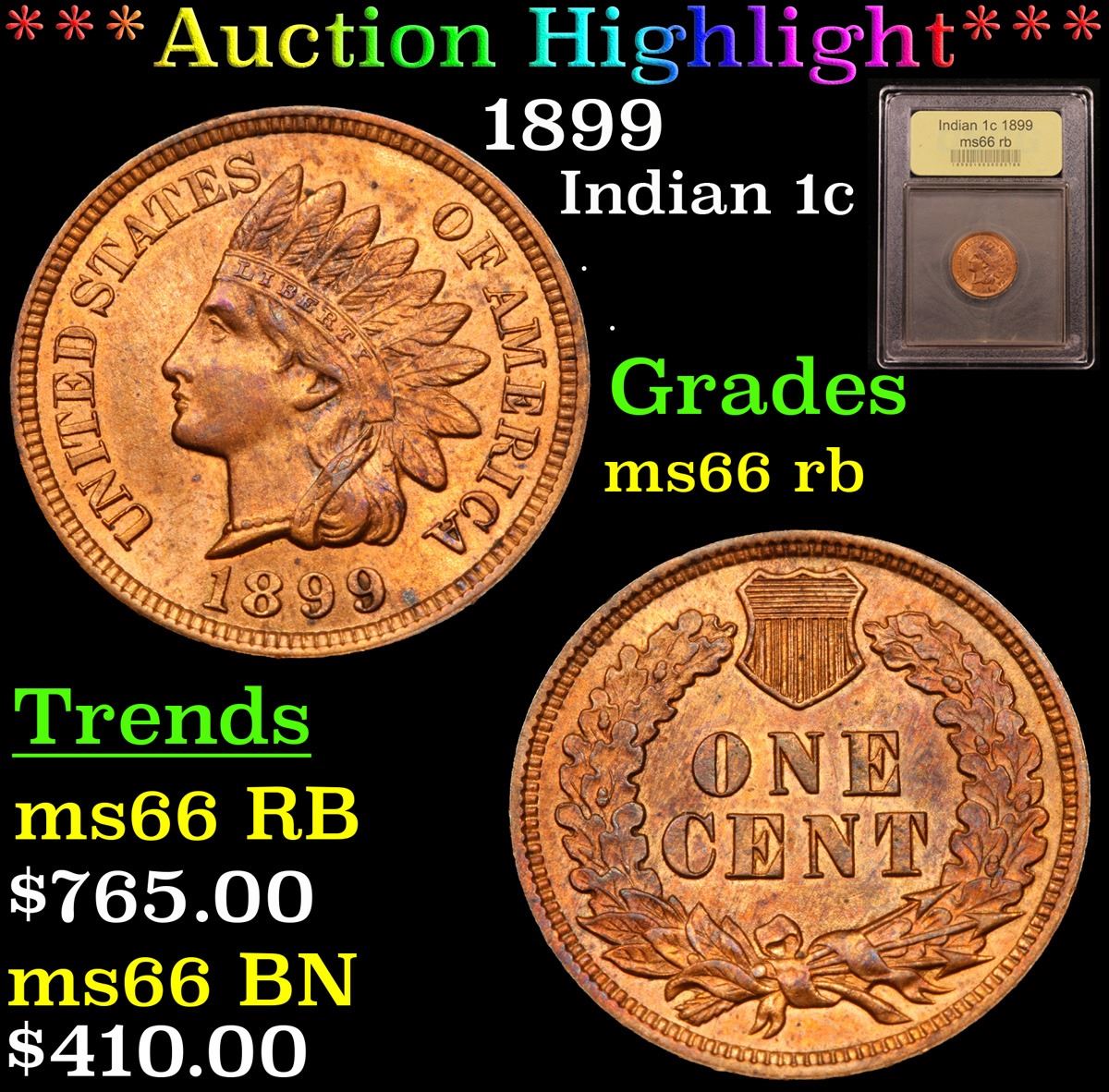 ***Auction Highlight*** 1899 Indian Cent 1c Graded GEM+ Unc RB By USCG. A Corey's Pick, Bid to Win, Don't let it get Away Coin