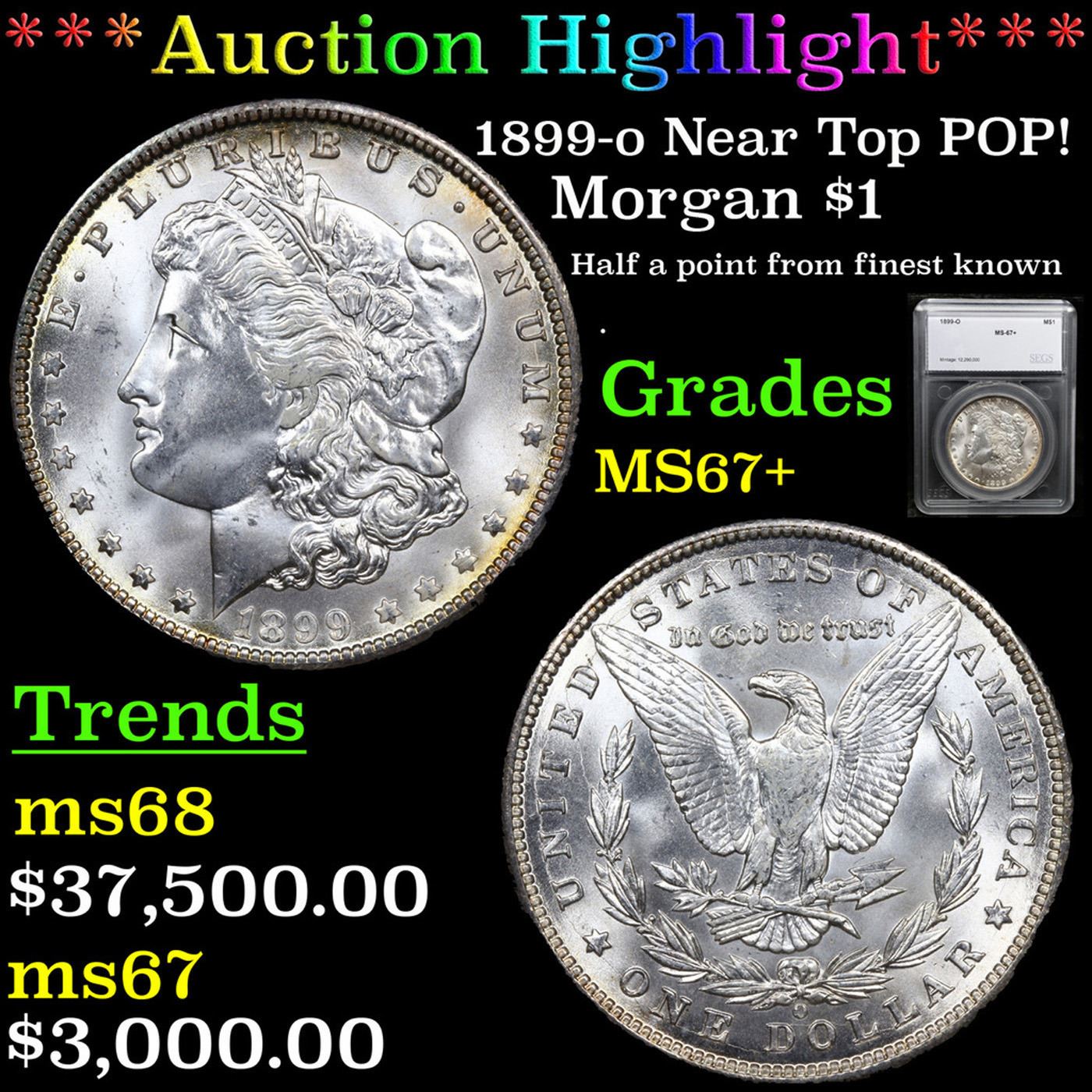 ***Auction Highlight*** 1899-o Near Top POP! Morgan Dollar 1 Graded MS67+ by SEGS. A Corey's Pick, Bid to Win, Don't let it get Away, you might not find its equal Coin. I give this coin my highest recommendation