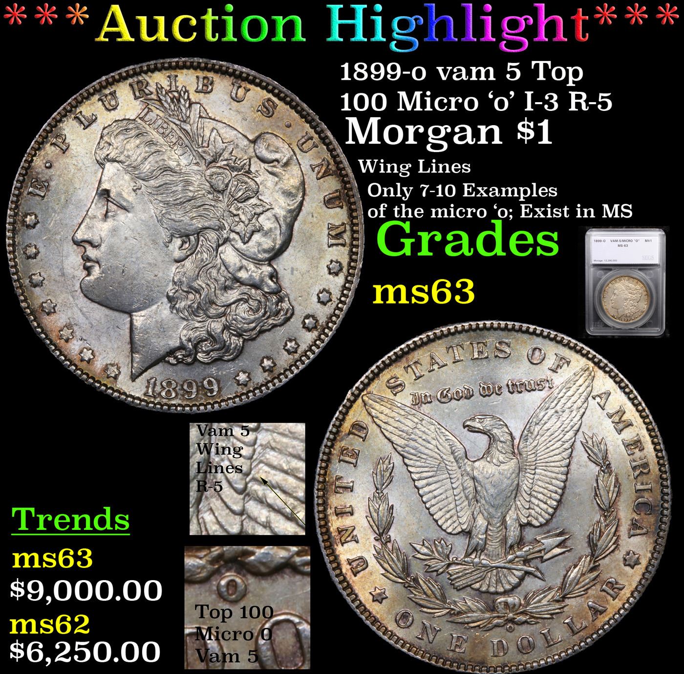 ***Auction Highlight*** 1899-o vam 5 Top 100 Micro 'o' I-3 R-5 Morgan $1 Graded ms63 By SEGS. A Top 100 Variety. VAM-5 is arguably the scarcest and most significant of the five Micro O varieties, as it also exhibits numerous, heavy, parallel die lines in the eagle's right (facing) wing. Most certified examples of this variety are in circulated grades, and scarcely seen even at that level. In Mint State, only 7-10 pieces exist. Ultra Rare. A wonderful lightly and attractively toned example. Good Luck in obtaining this highly sought rarity. A Corey's Pick, Bid to Win, Don't let it get Away, you might not find its equal Coin. I give this coin my highest recommendation