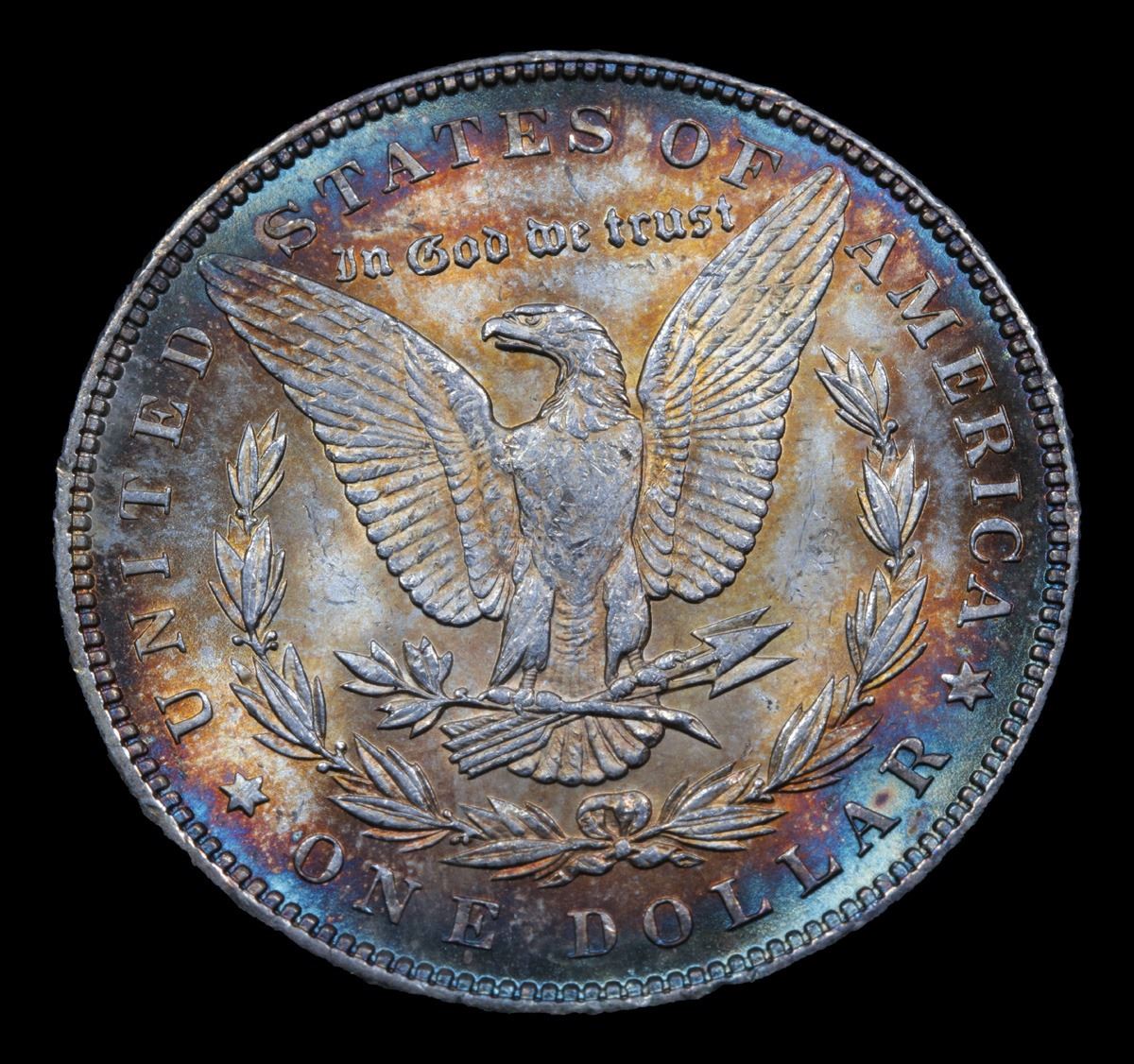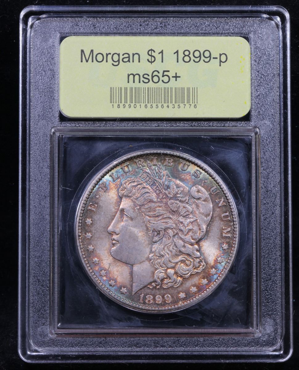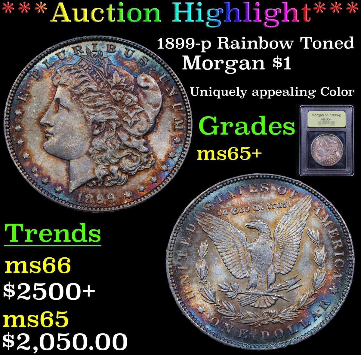 ***Auction Highlight*** 1899-p Rainbow Toned Morgan Dollar $1 Graded GEM+ Unc By USCG. Up for auction is a Rainbow Toned 1889-p.This lovely, Plus-graded Premium Gem displays bold central detail and virtually pristine surfaces. Delicate lavender-blue and yellow-gold hues adorn the obverse, while the Semi Proof LIke reverse displays ocean-blue and lemon-yellow color. The 1899 Morgan dollar is seldom seen in finer condition A Corey's Pick, Bid to Win, Don't let it get Away, you might not find its equal Coin