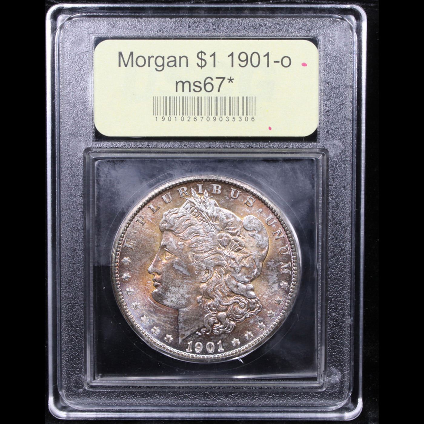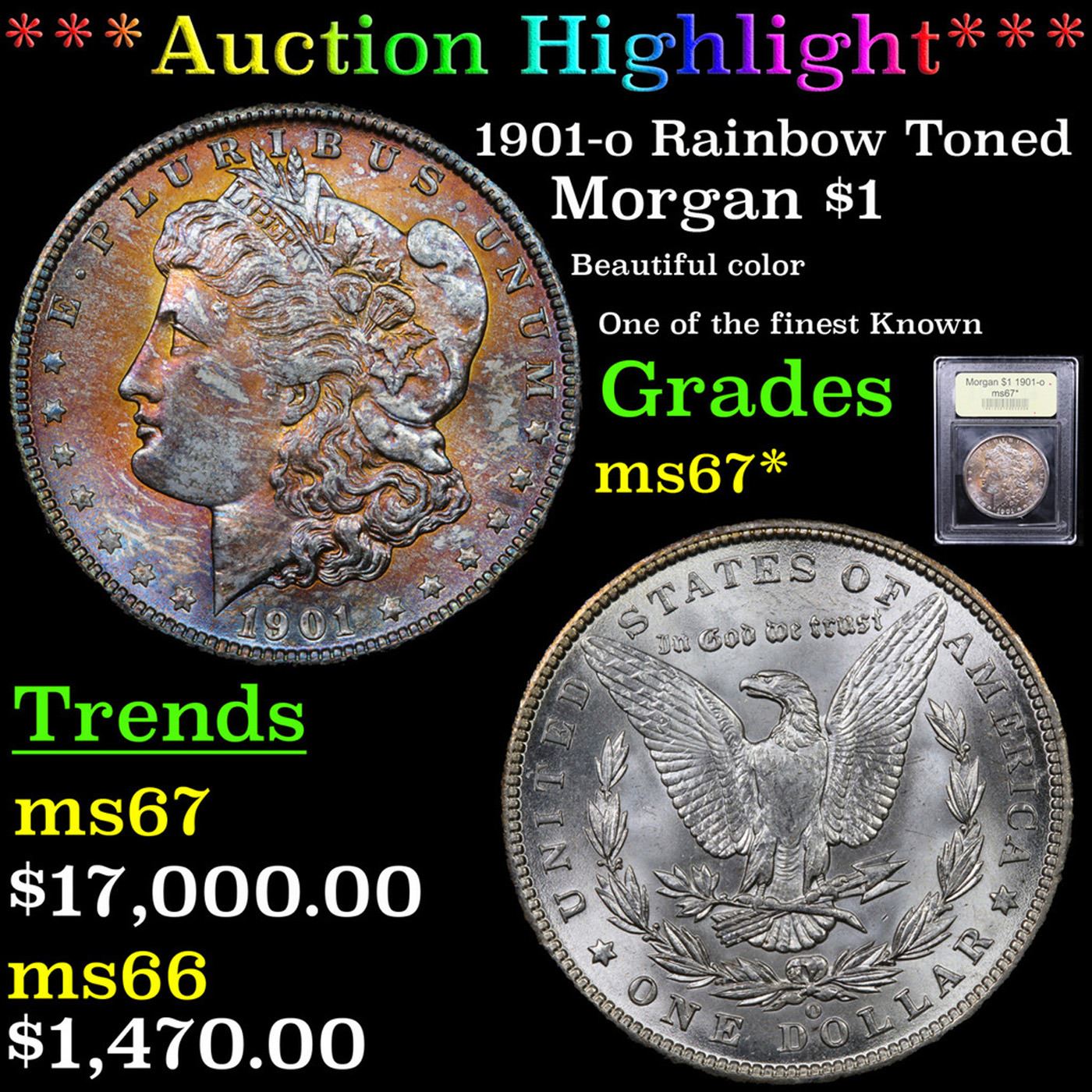 ***Auction Highlight*** 1901-o Rainbow Toned Morgan Dollar 1 Graded GEM++ Unc By USCG. A simply outstanding Premium Gem Morgan dollar from every standpoint. The luster is bold with lively cartwheel activity and a stunning Rainbow Toned Obverse. The strike is sharp for the date and essentially complete, and the satiny surfaces approach pristine quality from the first glance to the last. There are many hundreds of MS-66 examples of this date to choose from in the numismatic marketplace, but there the otherwise common nature of the date ceases to be. In MS-67, as here, the issue becomes rare. Of the 21 examples at NGC, only one other piece has been awarded a star for eye appeal, making this example even more desirable. It is difficult to imagine a much finer 1901-O Morgan dollar though PCGS has certified a lone MS-68 example. That MS-68 no doubt resides in an extremely advanced and permanent Morgan dollar collection, and has not been seen since its sale in the Legend auction of 2015 for $55,813. That aside, the present piece could easily represent the finest example of the date you are apt to find in today's marketplace, and savvy bidders will react accordingly. Note the Last Non Star ms67 to sell at auction sold for $10,200 in 2020. And the two before that in 2019 for $15,275 and $16,800. None of which had the Star Designation. One of the Finest Known. A Corey's Pick, Bid to Win, Don't let it get Away, you might not find its equal Coin. I give this coin my highest recommendation