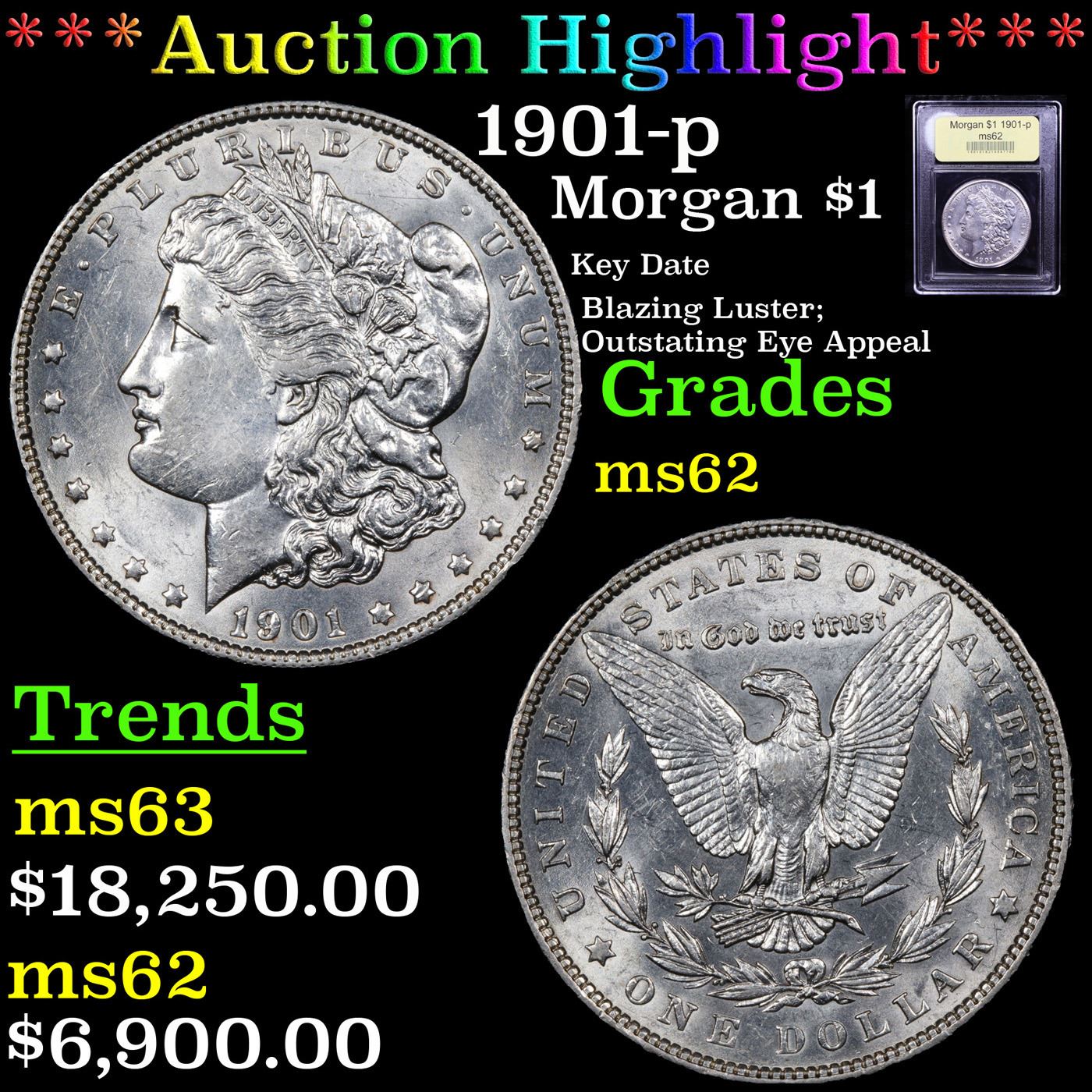 ***Auction Highlight*** 1901-p Morgan Dollar $1 Graded Select Unc By USCG. The 1901 Morgan dollar is much more elusive than its mintage of more than 6.9 million pieces would suggest, especially in high grade. Most coins not released into circulation were probably melted in 1918, under the provisions of the Pittman Act. This impressive MS62 example is nicely detailed and highly lustrous, with lightly marked surfaces that show no noticeable toning. Flashy is the best way to describe this terrific example. A Corey's Pick, Bid to Win, Don't let it get Away, you might not find its equal Coin. I give this coin my highest recommendation