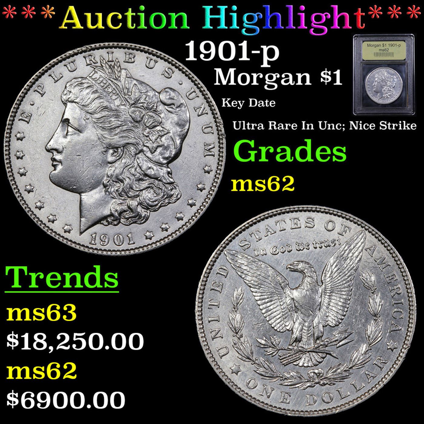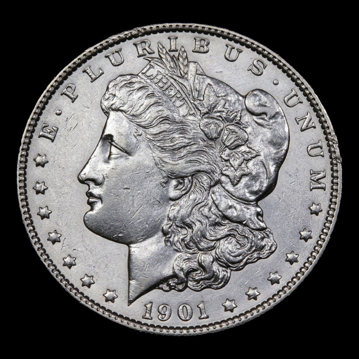 ***Auction Highlight*** 1901-p Morgan Dollar $1 Graded Select Unc By USCG. The 1901 Morgan dollar is much more elusive than its mintage of more than 6.9 million pieces would suggest, especially in high grade. Most coins not released into circulation were probably melted in 1918, under the provisions of the Pittman Act. This impressive MS62 example is nicely detailed and highly lustrous, with lightly marked surfaces that show silver grey virtually untoned patina. A Corey's Pick, Bid to Win, Don't let it get Away, you might not find its equal Coin