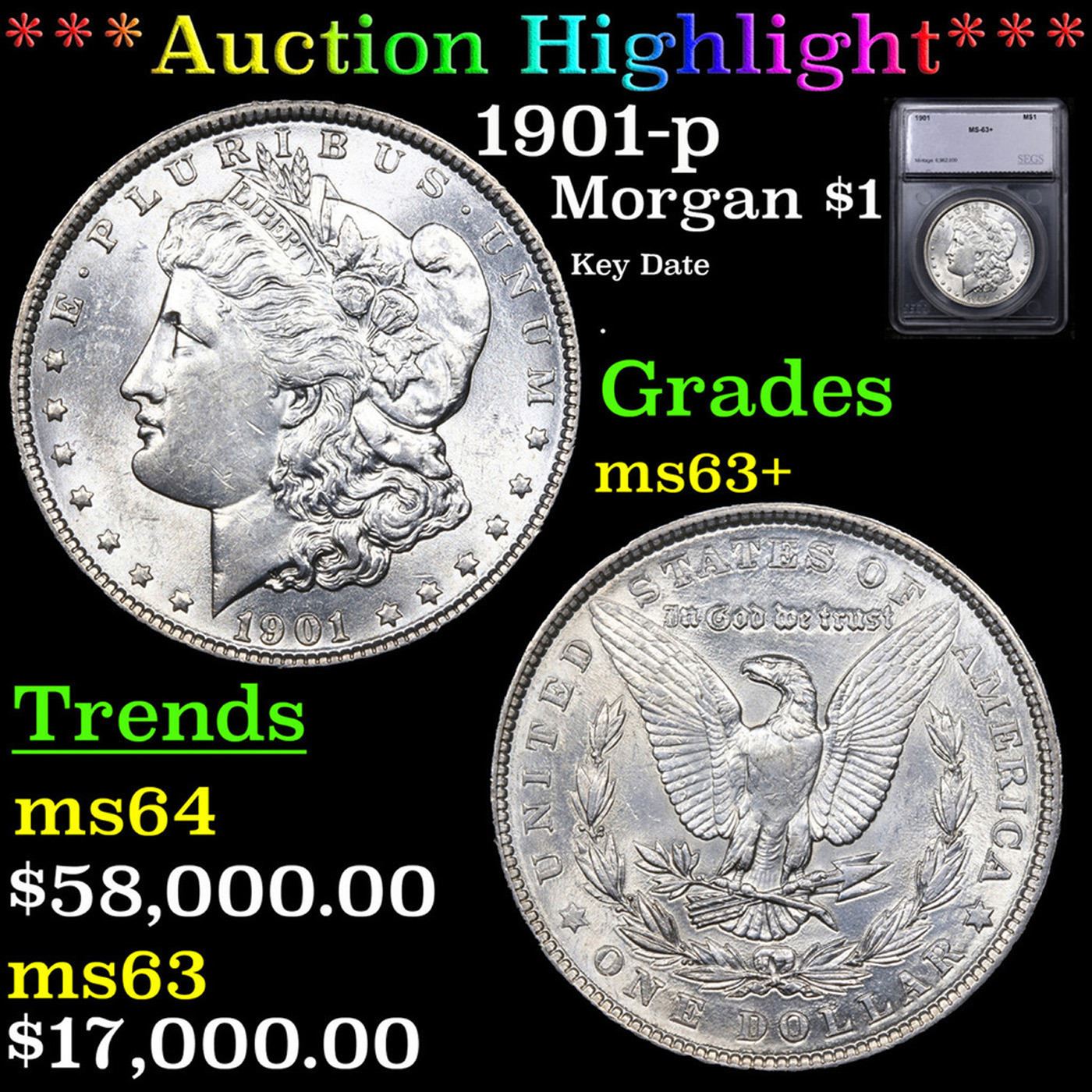 ***Auction Highlight*** 1901-p Morgan Dollar $1 Graded ms63+ BY SEGS. A Key Date's Pick, Bid to Win, Don't let it get Away, you might not find its equal Coin. I give this coin my highest recommendation