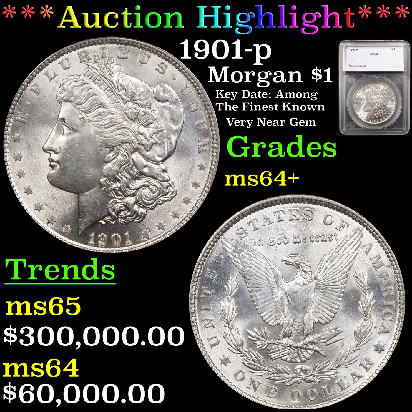 ***Auction Highlight*** 1901-p Morgan Dollar $1 Graded ms64+ By SEGS. A Corey's Pick, Bid to Win, Don't let it get Away, you might not find its equal Coin. I give this coin my highest recommendation