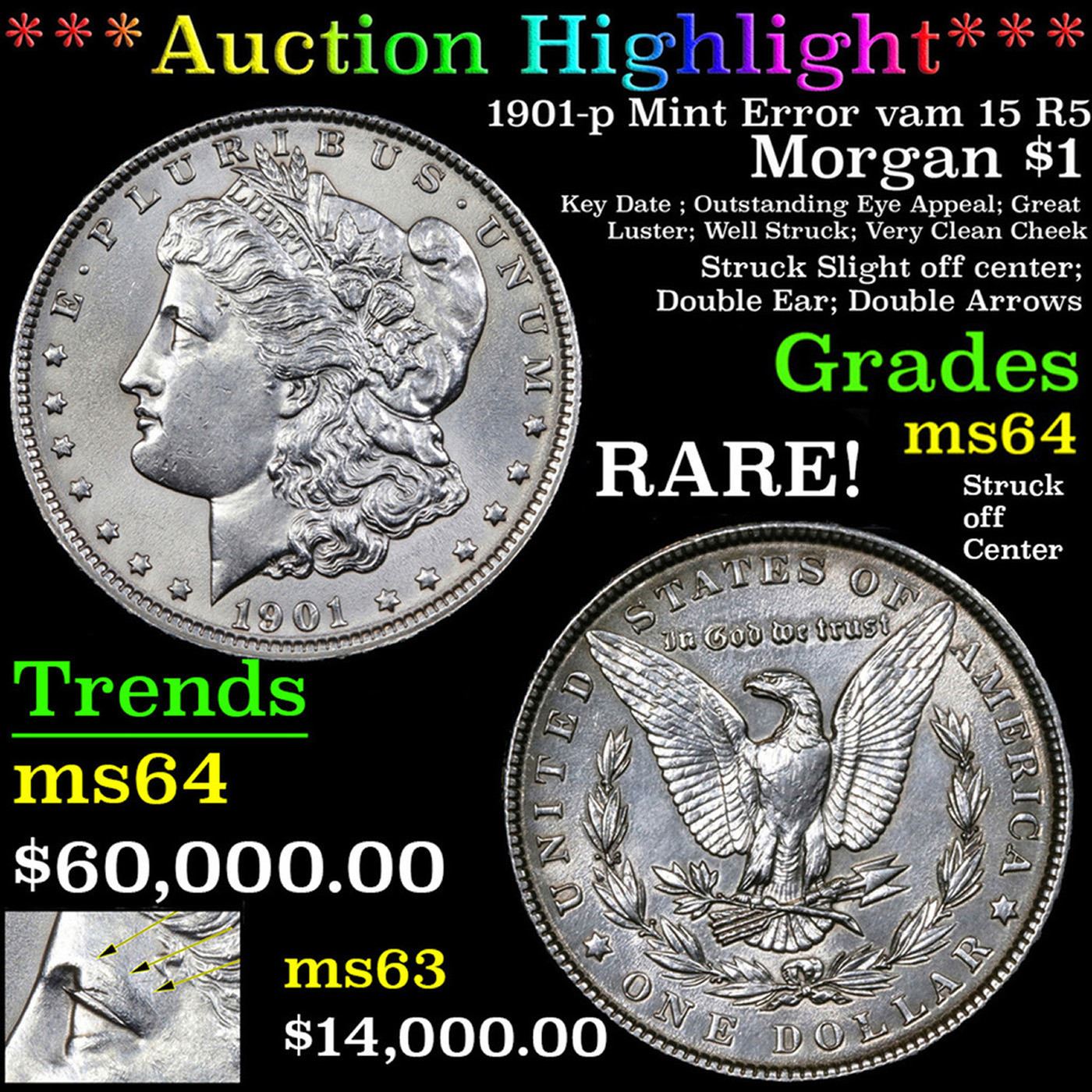 ***Auction Highlight*** 1901-p Mint Error vam 15 R5 Morgan Dollar $1 Graded Choice Unc By USCG. Up for auction is an incredible 1901-p Morgan Dollar. Clean Surfaces for the Grade, A Major Rarity This Fine. The 1901 Morgan dollar is an elite condition rarity. Despite a mintage in excess of 6.9 million coins, the date is scarce in Mint State, rapidly decreasing in availability at each ascending grade level. It is believed that most of the coins not released into circulation at the time of issue were destroyed after 1918 under the terms of the Pittman Act. For most collectors, the finest 1901 Morgan dollars collectible are in MS64. The last two PCGS-graded pieces that were auctioned in this grade realized $52,800 and $55,200, respectively. Gems are almost unheard of today, even though a handful are reported by the grading services. The last to sell at auction was an NGC coin in Bowers and Merena's November 2009 Baltimore auction, which realized more than $155,000. Clearly, the rarity of the 1901 Morgan dollar in high grade is not at all overstated. This near-Gem is blast white with superb satin luster. The strike is a trifle soft on the eagle's breast feathers but is bold elsewhere. To the unaided eye, the coin appears a grade point finer, but a loupe reveals a few faint marks that affirm the MS64 designation. Additionally this incredible coin is not only a conditional rarity but it is both the Vam 15, a R-5 variety, and a mint error, in that it is struck slightly off center on the obverse. WOW. We look forward to this coin's sale with great anticipation. A Corey's Pick, Bid to Win, Don't let it get Away, you might not find its equal Coin. I give this coin my highest recommendation