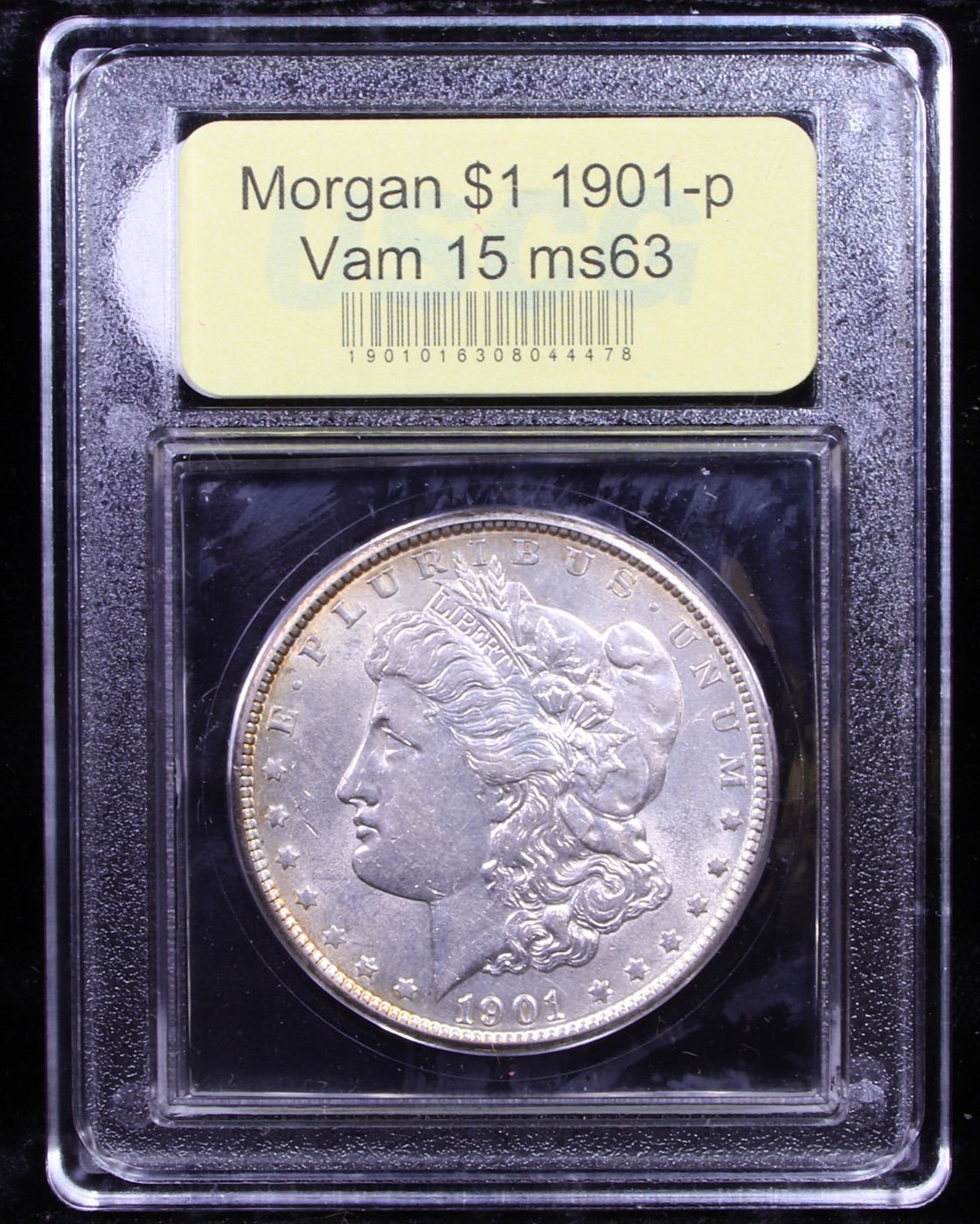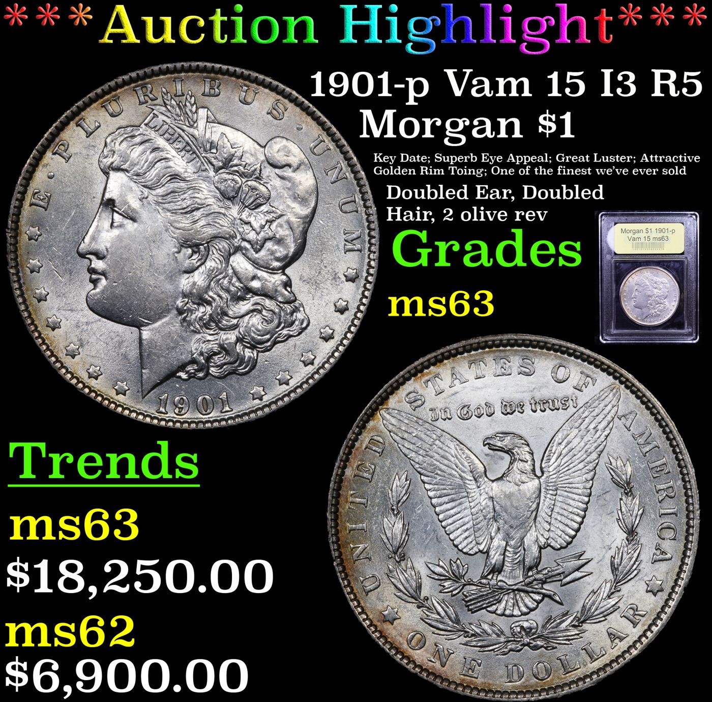 ***Auction Highlight*** 1901-p Vam 15 I3 R5 Morgan Dollar $1 Graded Select Unc By USCG. Noteworthy Choice quality for a Morgan dollar issue that is a well known rarity even in the lowest Mint State grades. Both sides are uncommonly lustrous for the issue with lively mint frost and swirling cartwheel visual effects to the finish. Brilliant apart from superb golden rim toning, a sharply executed strike further enhances this coin's immense appeal. Produced to the extent of 6,962,000 circulation strikes, the 1901 has a generous mintage by Morgan dollar standards. The number of coins struck, however, conceals the rarity of this issue in Mint State. Thousands of examples seem to have been released into circulation at or near the time of striking. Even so, much of the mintage was likely retained in federal vaults until destroyed pursuant the terms of the 1918 Pittman Act. The 1901 is the scarcest Philadelphia Mint Morgan dollar in Mint State, the present offering a rare find in today's market. A Corey's Pick, Bid to Win, Don't let it get Away, you might not find its equal Coin. I give this coin my highest recommendation