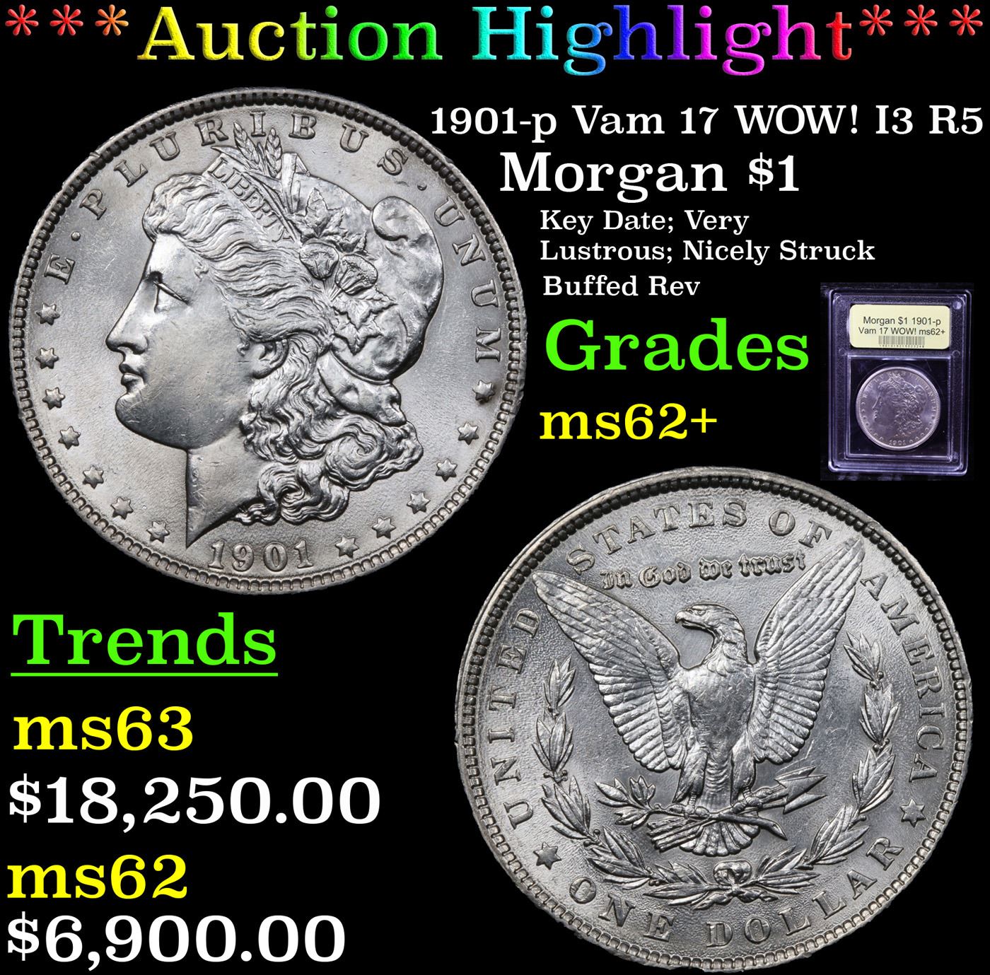 ***Auction Highlight*** 1901-p Vam 17 WOW! I3 R5 Morgan Dollar $1 Graded Select Unc By USCG. Up for Auction is a Lustrous and nicely struck 1901-p. The 01-p is the hardest Philadelphia minted Morgan in the entire series to locate in Uncirculated condition. This example has Highly Lustrous surfaces that are near mark free with silver untoned surfaces. Well stuck with just a touch of weakness in the center devices. The coin is also part of the WOW Morgan Vam series as it has the Buffed Reverse. Vam 17. A superb example of a conditionally challenging coin. A Corey's Pick, Bid to Win, Don't let it get Away, you might not find its equal Coin. I give this coin my highest recommendation