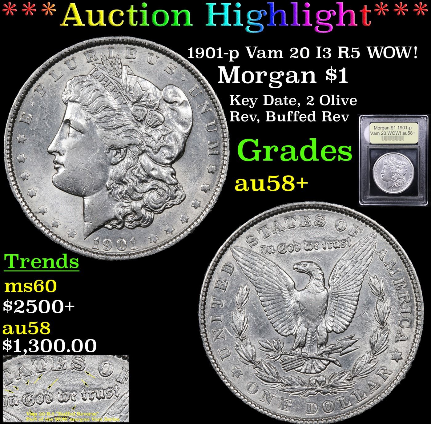 ***Auction Highlight*** 1901-p Vam 20 I3 R5 WOW! Morgan Dollar $1 Graded Choice AU/BU Slider+ By USC