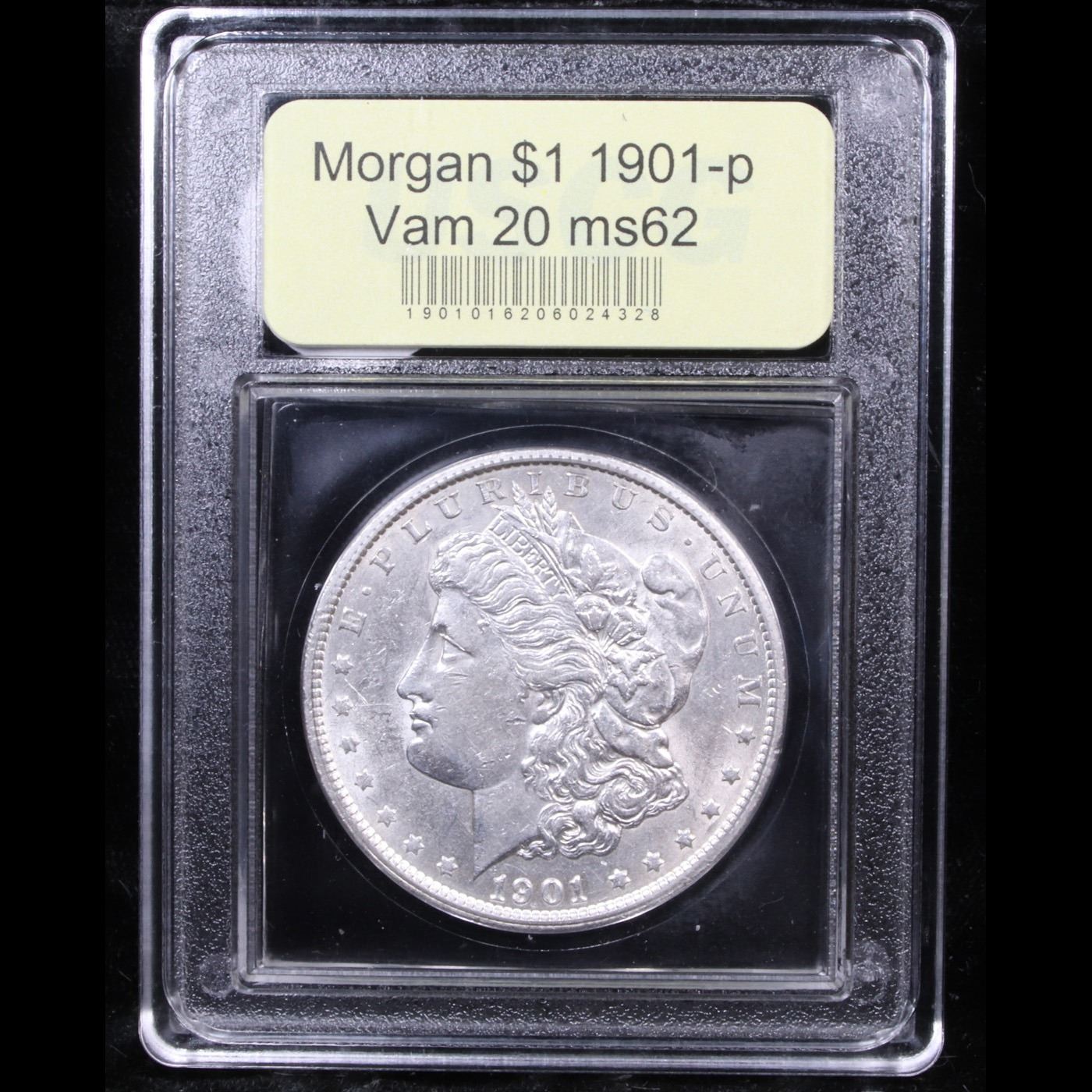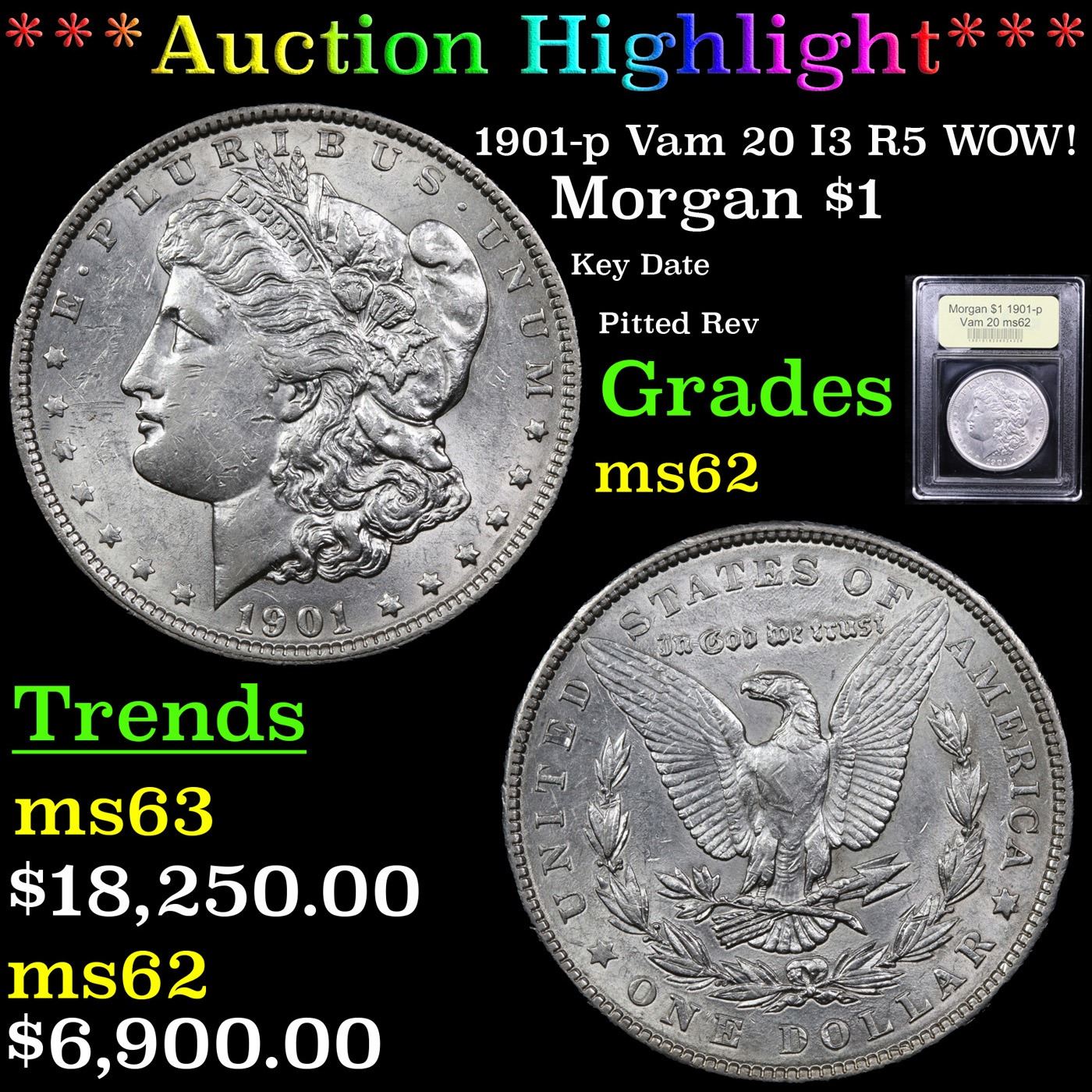 ***Auction Highlight*** 1901-p Vam 20 I3 R5 WOW! Morgan Dollar $1 Graded Select Unc By USCG. Noteworthy Choice quality for a Morgan dollar issue that is a well known rarity even in the lowest Mint State grades. Both sides are uncommonly lustrous for the issue with lively mint frost and swirling cartwheel visual effects to the finish. Brilliant throughout the obverse and reverse., a nicely executed strike further enhances this coin's immense appeal. Produced to the extent of 6,962,000 circulation strikes, the 1901 has a generous mintage by Morgan dollar standards. The number of coins struck, however, conceals the rarity of this issue in Mint State. Thousands of examples seem to have been released into circulation at or near the time of striking. Even so, much of the mintage was likely retained in federal vaults until destroyed pursuant the terms of the 1918 Pittman Act. The 1901 is the scarcest Philadelphia Mint Morgan dollar in Mint State, the present offering a rare find in today's market. A Corey's Pick, Bid to Win, Don't let it get Away, you might not find its equal Coin. I give this coin my highest recommendation