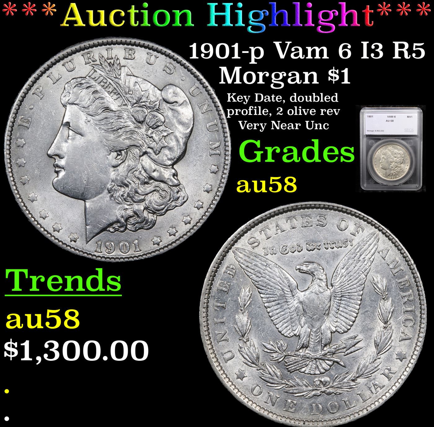 ***Auction Highlight*** 1901-p Vam 6 I3 R5 Morgan Dollar $1 Graded au58 By SEGS.