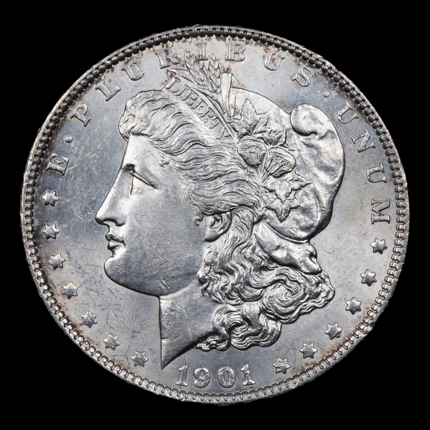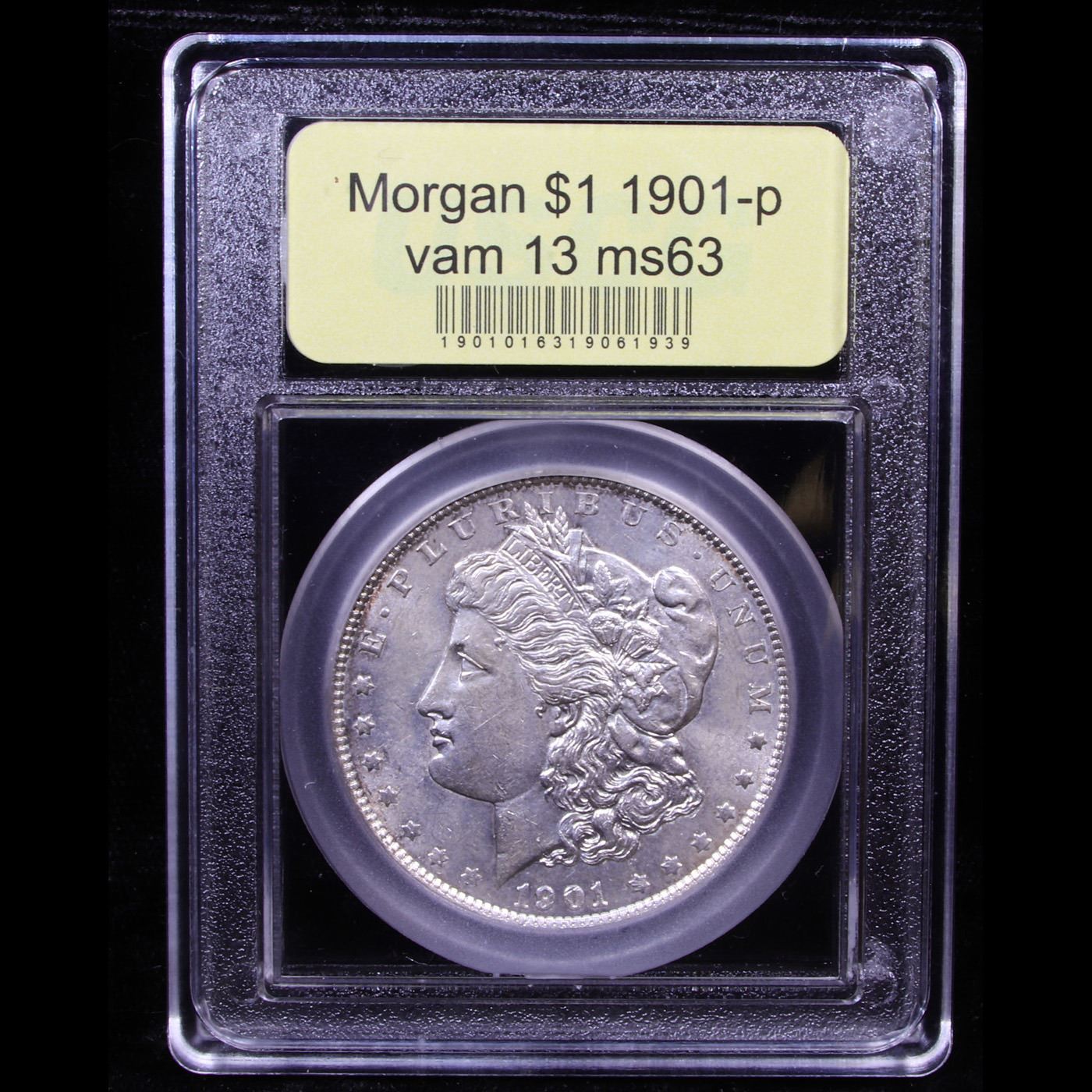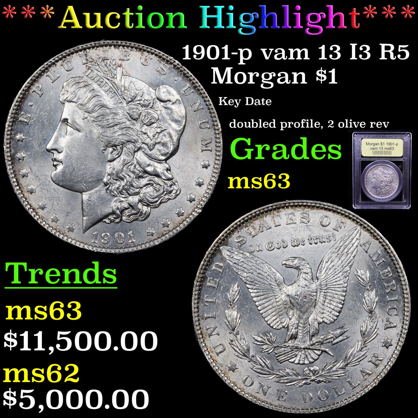 ***Auction Highlight*** 1901-p vam 13 I3 R5 Morgan Dollar $1 Graded Select Unc By USCG. The 1901 Morgan dollar claims a mintage of nearly 7 million pieces, but most of the coins were released into circulation near the time of issue and show many signs of wear and surface damage. Many more examples were undoubtedly melted under the provisions of the Pittman Act in 1918. As a result, the 1901 is the rarest Morgan dollar from the Philadelphia Mint in really high-grade condition. This high-end ms63 example offers sharply detailed design elements and vibrant cartwheel mint luster on both sides. The surfaces are brilliant, with virtually no toning. A scattering of minor contact marks on both sides does little to detract from the outstanding eye appeal. A Corey's Pick, Bid to Win, Don't let it get Away Coin
