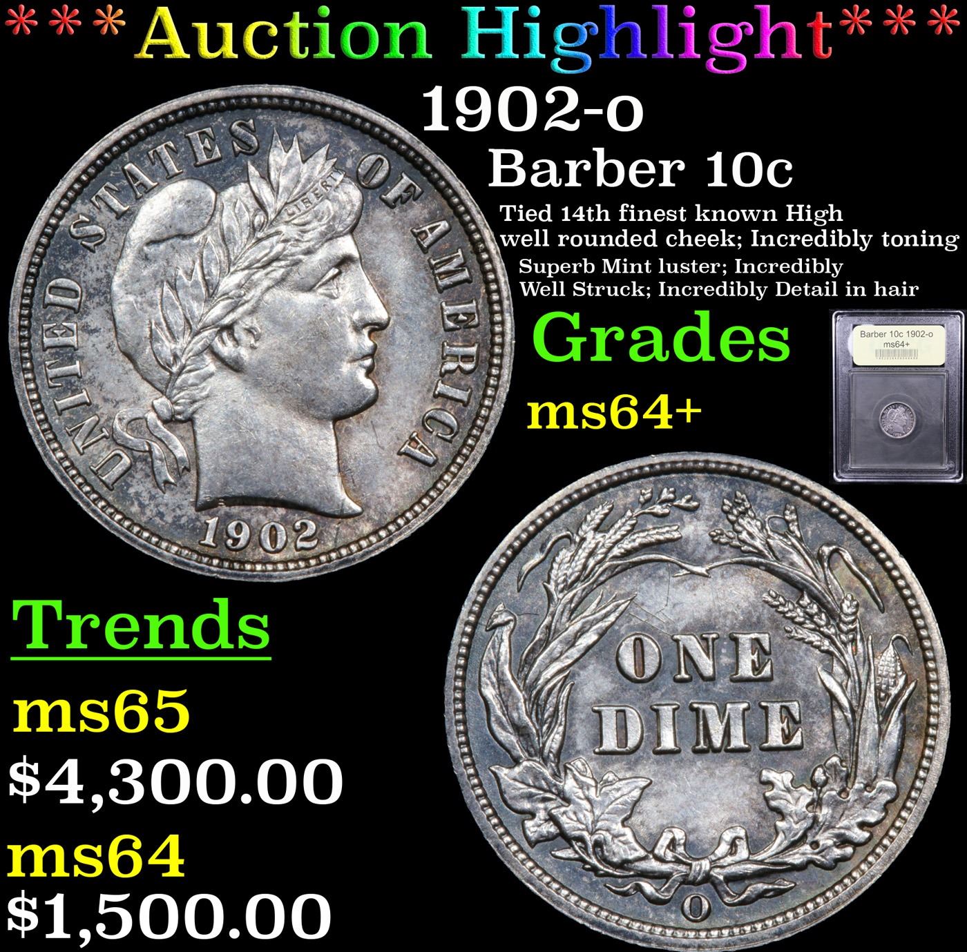 ***Auction Highlight*** 1902-o Barber Dime 10c Graded Choice+ Unc By USCG. Much better date. A scarce coin. Frosty original luster and sharp design elements are the hallmarks of this Choice coin. This sharply struck example has mottled peripheral toning on satiny surfaces. As with most mint marked issues in the Barber dime series, the 1902-O saw extensive commercial use with high grade survivors elusive in numismatic circles. In fact, this is the rarest 20th century New Orleans Mint issue of its type in Mint State, and it is also more challenging to locate than the earlier date 1892-O, 1893-O and 1897-O. A Corey's Pick, Bid to Win, Don't let it get Away, you might not find its equal Coin