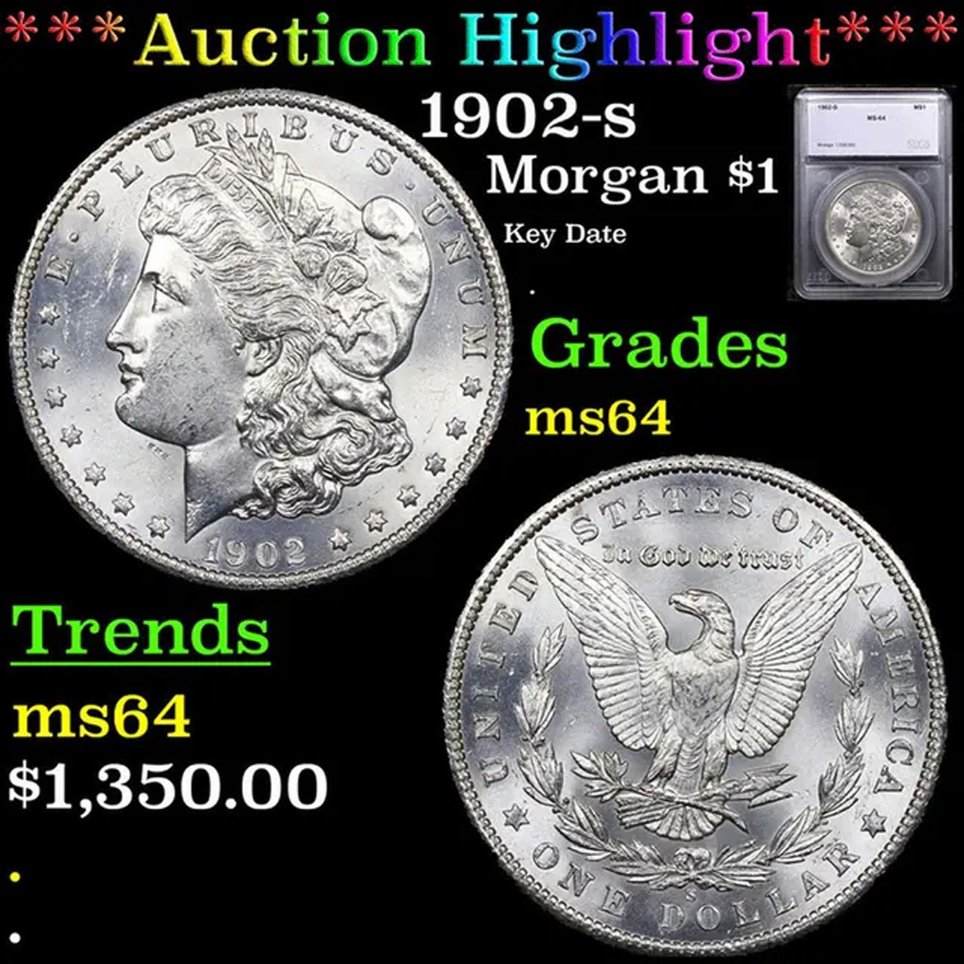 ***Auction Highlight*** 1902-s Morgan Dollar $1 Graded ms64 BY SEGS. A Key Date's Pick, Bid to Win, Don't let it get Away, you might not find its equal Coin. I give this coin my highest recommendation