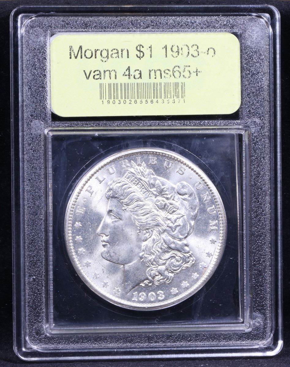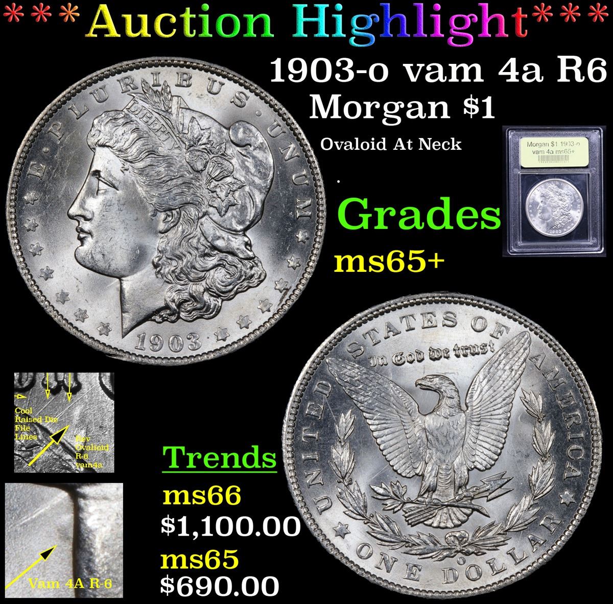 ***Auction Highlight*** 1903-o vam 4a R6 Morgan Dollar $1 Graded GEM+ Unc By USCG. Up for auction is the Always scarce 1903-o Morgan Dollar. Additionally it is the Ultra rare Vam 4A variety. The 4a is a Rarity 6 variety. To quote John Roberts of Vamworld : �This piece represents a new class of clashed die variety. The 'ovaloid' feature of the VAM-4A is a form of die failure associated with multiple clashing of dies. Many other clashed stage varieties exhibit this characteristic. Most, but not all, are already listed for letter transfer clashmarks.� I have included closeups of both ovaliods. A Corey's Pick, Bid to Win, Don't let it get Away Coin