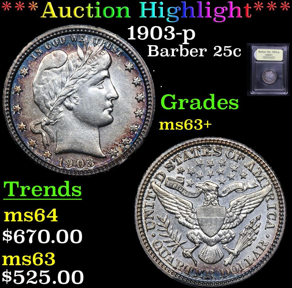 ***Auction Highlight*** 1903-p . . Barber Quarter 25c Graded Select+ Unc By USCG. According to David Lawrence's' book "The Complete Guide to Barber Quarters" he says "this date (The 1903-p) is greatly undervalued in all mint state grades." A Corey's Pick, Bid to Win Coin