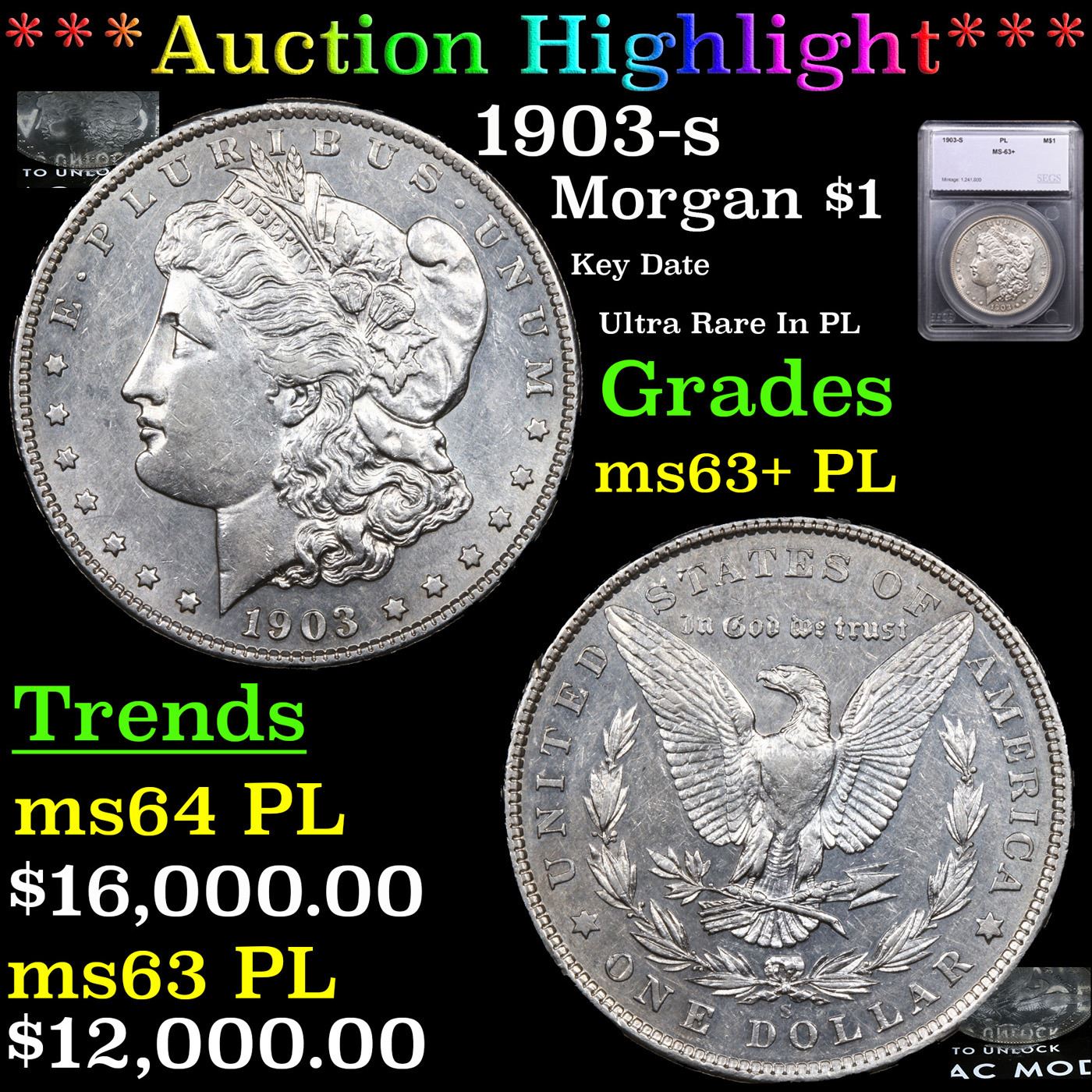***Auction Highlight*** 1903-s Morgan Dollar $1 Graded ms63+ PL BY SEGS. A Corey's Pick, Bid to Win, Don't let it get Away, you might not find its equal Coin. I give this coin my highest recommendation