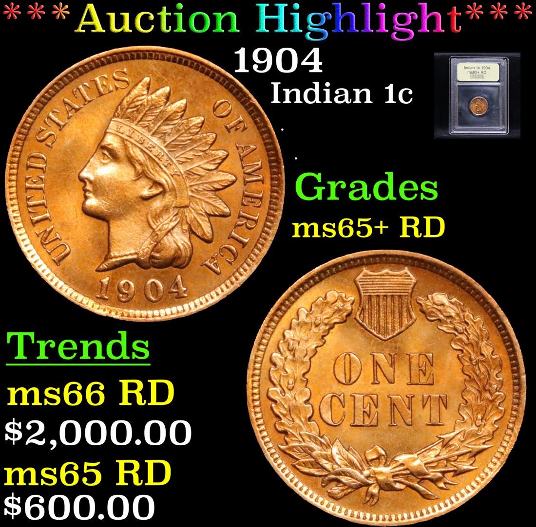***Auction Highlight*** 1904 . . Indian Cent 1c Graded Gem+ Unc RD By USCG. A Corey's Pick, Bid to Win Coin