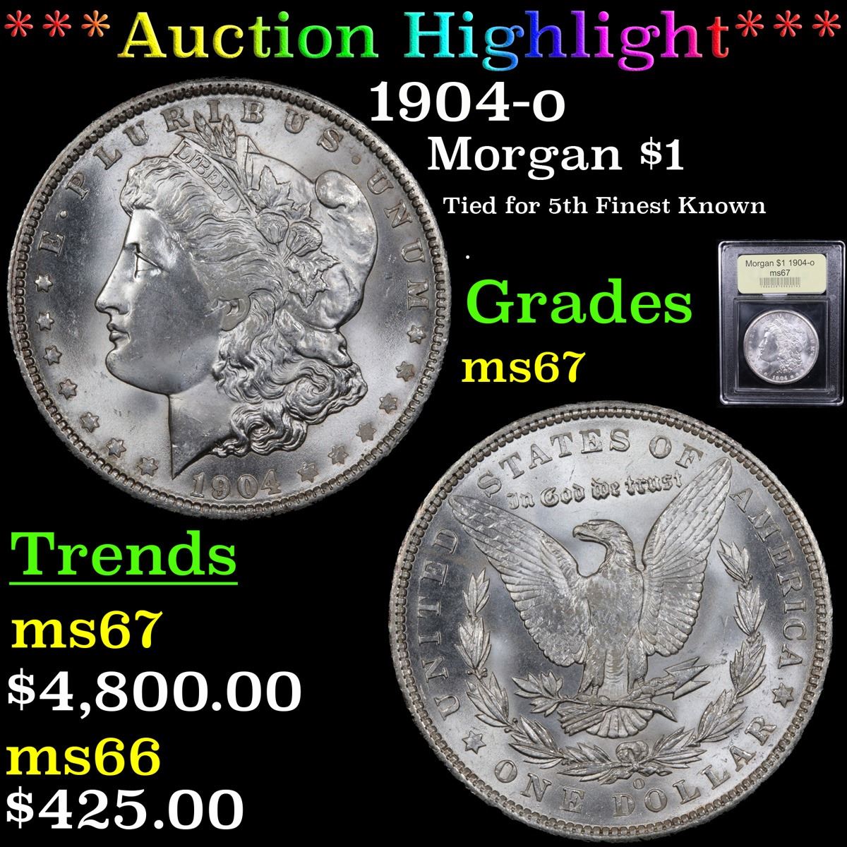 ***Auction Highlight*** 1904-o Morgan Dollar $1 Graded GEM++ Unc BY uSCG. Silky smooth in texture with intense mint luster, this bright and brilliant Superb Gem makes a lovely impression in all regards. The final New Orleans Mint silver dollar, the 1904-O was produced to the extent of 3,720,000 pieces, the vast majority of which went into storage at the time of delivery. More than a million examples were released from the Philadelphia Mint and the Treasury Building in Washington, D.C. beginning in October of 1962, these releases making the 1904-O the most plentiful New Orleans Mint Morgan dollar in Mint State after only the 1885-O. Among the finest certified, however, the coin offered here is rare from a condition standpoint and worthy of inclusion in an advanced silver dollar cabinet. Tied for 5th inest know A Corey's Pick, Bid to Win, Don't let it get Away, you might not find its equal Coin. I give this coin my highest recommendation
