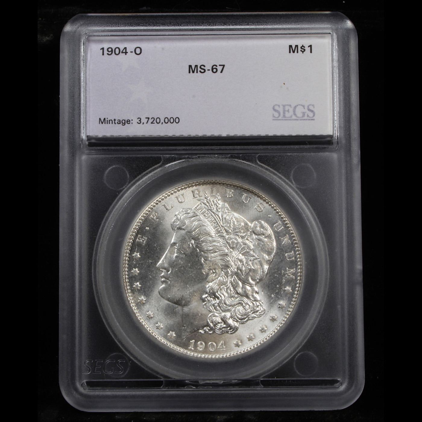 ***Auction Highlight*** 1904-o Morgan Dollar $1 Graded ms67 By SEGS. Silky smooth in texture with intense mint luster, this bright and brilliant Superb Gem makes a lovely impression in all regards. The final New Orleans Mint silver dollar, the 1904-O was produced to the extent of 3,720,000 pieces, the vast majority of which went into storage at the time of delivery. More than a million examples were released from the Philadelphia Mint and the Treasury Building in Washington, D.C. beginning in October of 1962, these releases making the 1904-O the most plentiful New Orleans Mint Morgan dollar in Mint State after only the 1885-O. Among the finest certified, however, the coin offered here is rare from a condition standpoint and worthy of inclusion in an advanced silver dollar cabinet. Tied for 7th finest known. A Corey's Pick, Bid to Win, Don't let it get Away, you might not find its equal Coin. I give this coin my highest recommendation