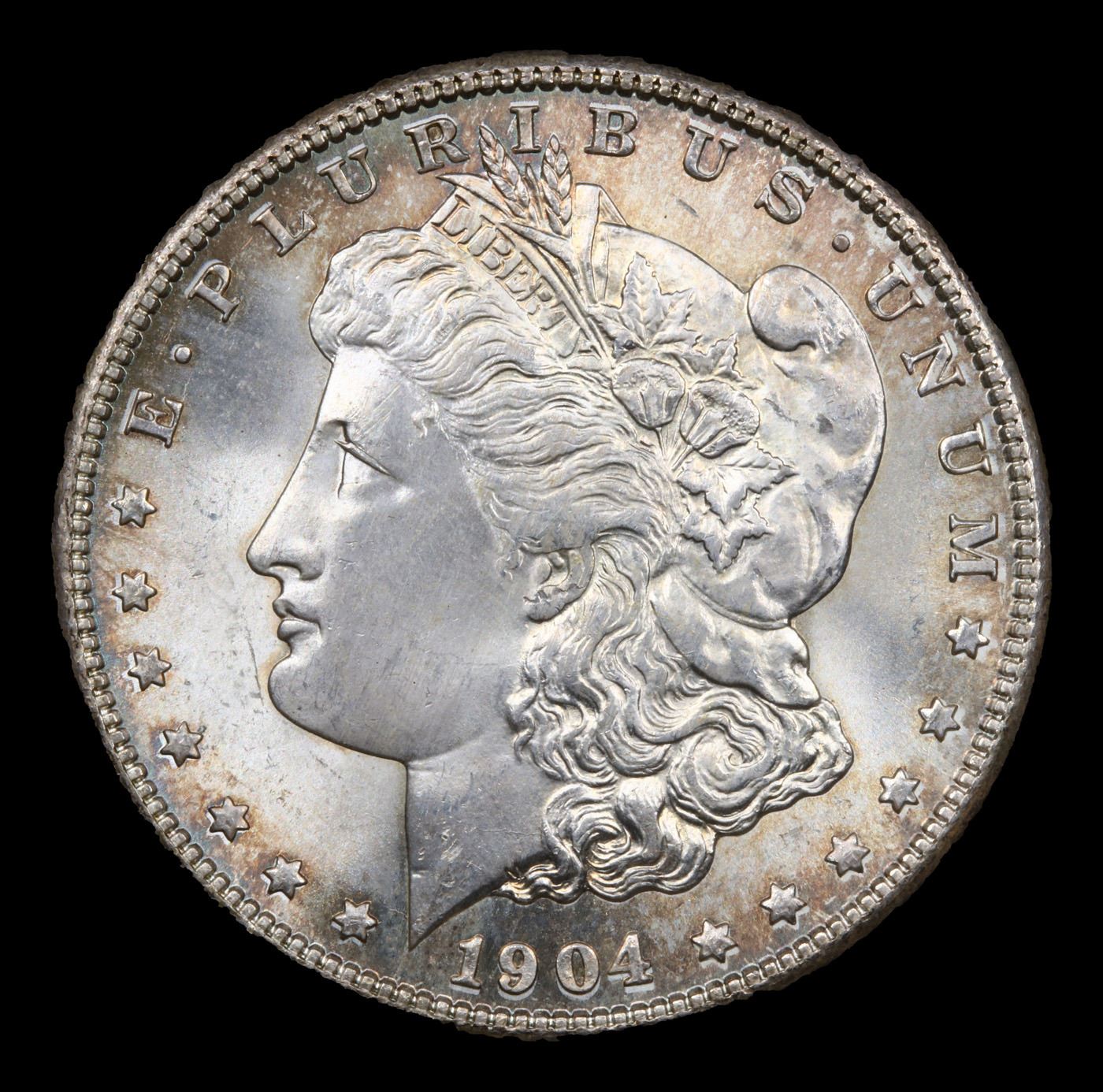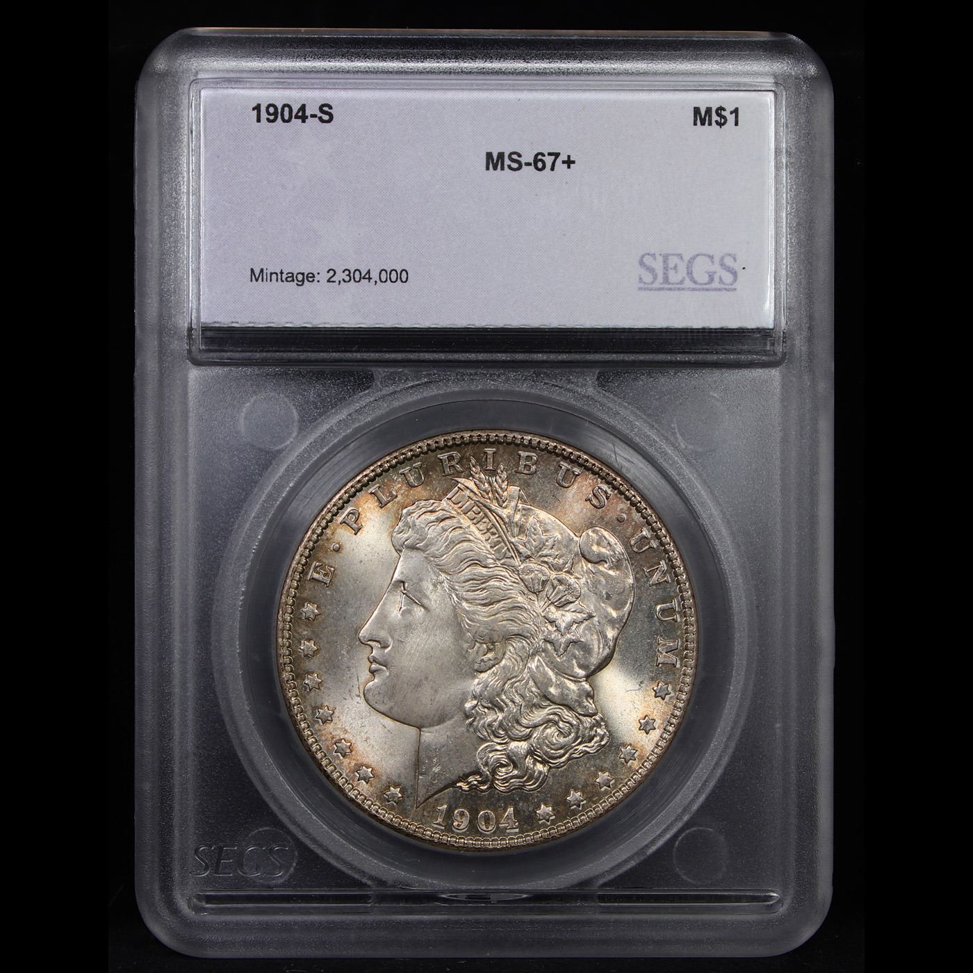 ***Auction Highlight*** 1904-s Morgan Dollar $1 Graded ms67+ By SEGS. SINGLE FINEST KNOWN EXAMPLE! The 1904-S Morgan, with a mintage of 2.304 million pieces, apparently saw a large number melted. David Bowers, in his Buyer's Guide to Silver Dollars of the United States, estimates that 2 million or so coins succumbed to later-day melts. Despite this, a fair number of specimens are available in the in the low to mid Mint State levels, due to modest Treasury releases in the 1930s and 1940s, along with one or more bags that came though Los Angeles Banks in the 1950s (Bowers, Silver Dollars and Trade Dollars of the United States). Bowers finds no accounts of any being in the 1962-1964 Treasury release, and apparently none was in the Redfield estate.